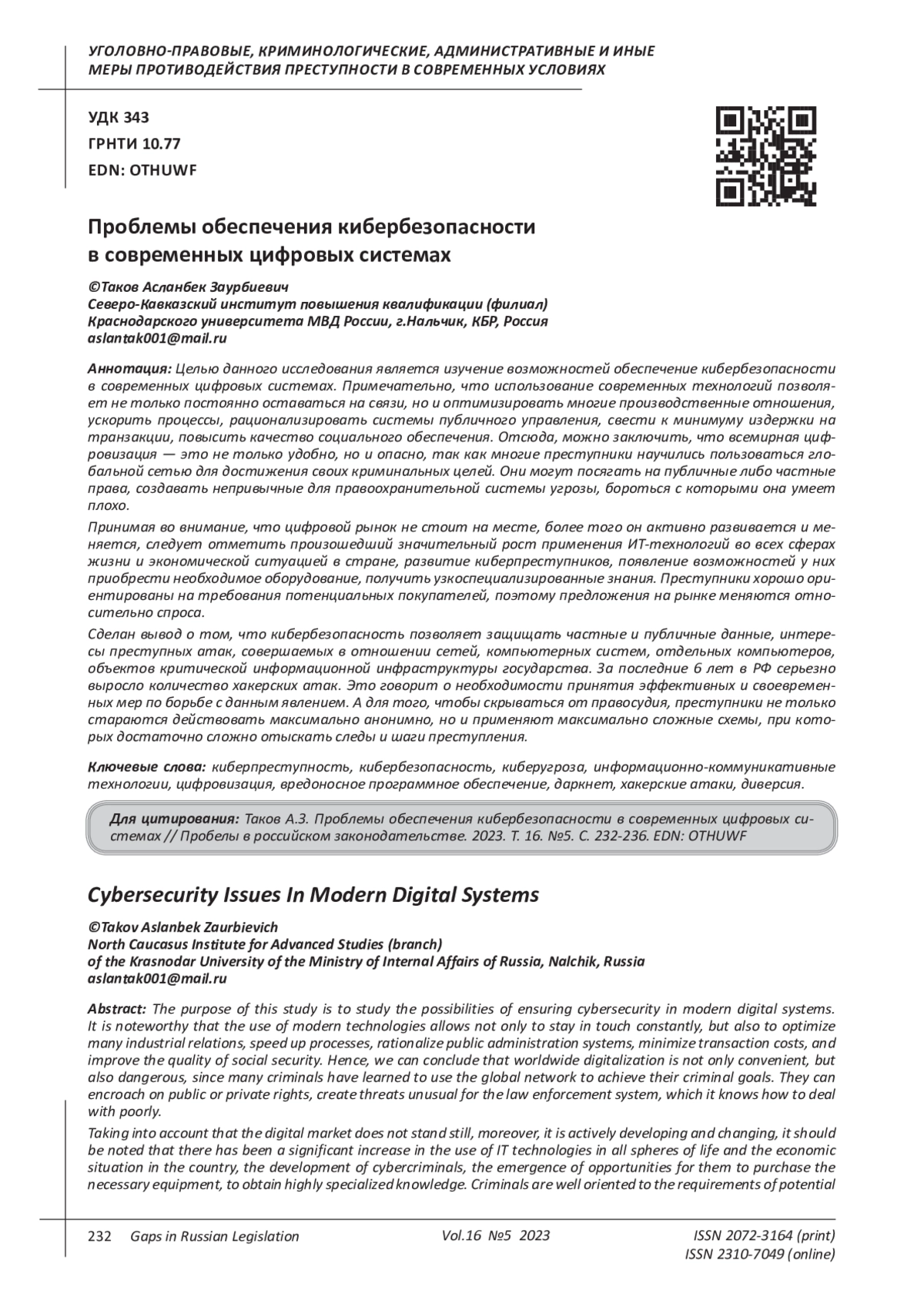 Zaikina S.E., Kesova Z.A. Problems of cybersecurity in the conditions of digitalization of the economy // In the collection: Trends in socio-economic development during the period of sanctions and digital transformation. Materials of the III International Scientific and Practical Conference. Krasnodar, 2023. pp. 459-464.