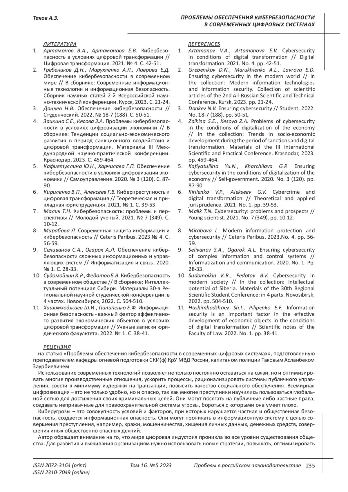 4. Заикина С.Е., Кесова З.А. Проблемы кибербезопасности в условиях цифровизации экономики // В сборнике: Тенденции социально-экономического развития в период санкционного воздействия и цифровой трансформации. Материалы III Международной научно-практической конференции. Краснодар, 2023. С. 459-464. EDN: ERHFVL
