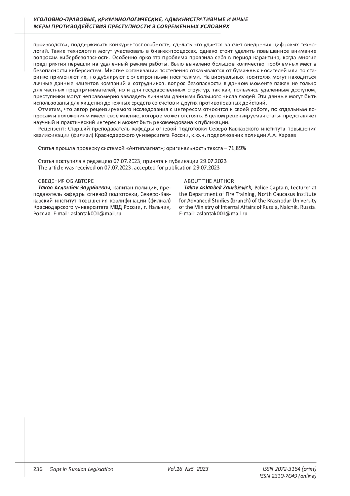 Hashimhodzhaev Sh.I., Pilipenko E.F. Information security is an important factor in the effective development of economic objects in the conditions of digital transformation // Scientific notes of the Faculty of Law. 2022. No. 1. pp. 38-41.