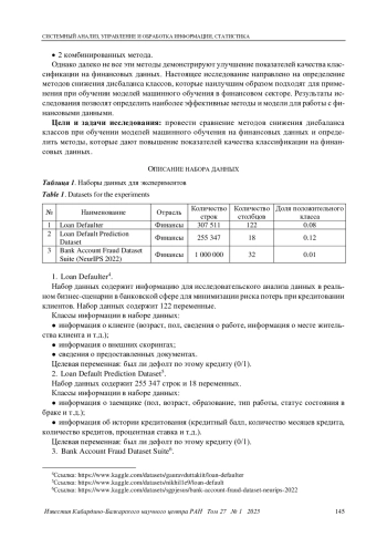 В статье рассматриваются методы улучшения показателей качества моделей машинного обучения, применяемых в финансовом секторе. В связи с тем, что наборы данных, на которых обучаются модели, обладают несбалансированностью классов, предлагается использовать модели, направленные на снижение дисбаланса. В исследовании были проведены эксперименты с применением 9 методов учета несбалансированности классов к трем наборам данных по розничному кредитованию. В качестве базовой использовалась модель градиентного бустинга CatboostClassifier, не учитывающая дисбаланс классов. Проведенные эксперименты показали, что применение метода RandomOverSampler дает существенный прирост показателей качества классификации по сравнению с базовой моделью. Результаты свидетельствуют о перспективности дальнейших исследований методов учета дисбаланса классов при изучении финансовых данных, а также о целесообразности применения рассмотренных методов на практике.