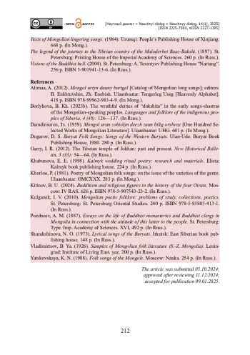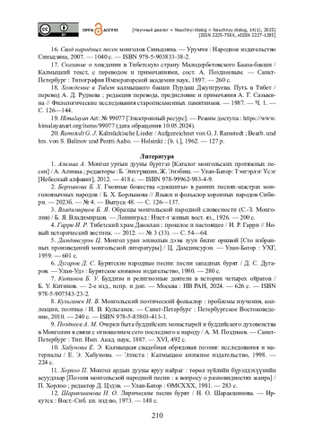 22. Борлыкова Б. Х. Гневные божества «докшиты» в ранних песнях-шастрах монголоязычных народов / Б. Х. Борлыкова // Языки и фольклор коренных народов Сиби-ри. - 2023б. - № 4. - Выпуск 48. - С. 126-137.