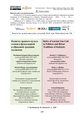 В статье рассматриваются реликты древнего культа поклонения солнцу, сохранившиеся в содержании мифов, сказочном фольклоре и в обрядовых действиях калмыков. Цель статьи — выявить следы древнего культа в фольклорной и обрядовой традиции, определить их символическое значение в сказочных сюжетах и обрядовых действиях. Материалом для исследования послужили образцы мифов, волшебных и богатырских сказок, а также обряды жизненного цикла. Доказано, что концепция божественности солнца и ее влияния на земную жизнь стала основой многих религиозно-мифологических представлений, следы которых обнаруживаются в разных аспектах духовно-религиозной жизни народа. Сообщается, что древний добуддийский календарный праздник Зул отмечается в дни зимнего солнцестояния. Анализ мифов, волшебных и богатырских сказок позволил выявить значимые мотивы: (1) так, с восходом солнца герой обретает волшебные предметы, сбываются загаданные им желания, выявляются следы нечистых сил; (2) отправляясь в путь, сказочные персонажи непременно начинают движение «посолонь», то есть по ходу движения солнца «в правильном направлении» (зөв эргәд), что сопряжено с устойчивым представлением об удачном свершении задуманного. Показано, что древняя концепция божественности небесного светила проявляется в наделении сказочного героя солярными признаками.