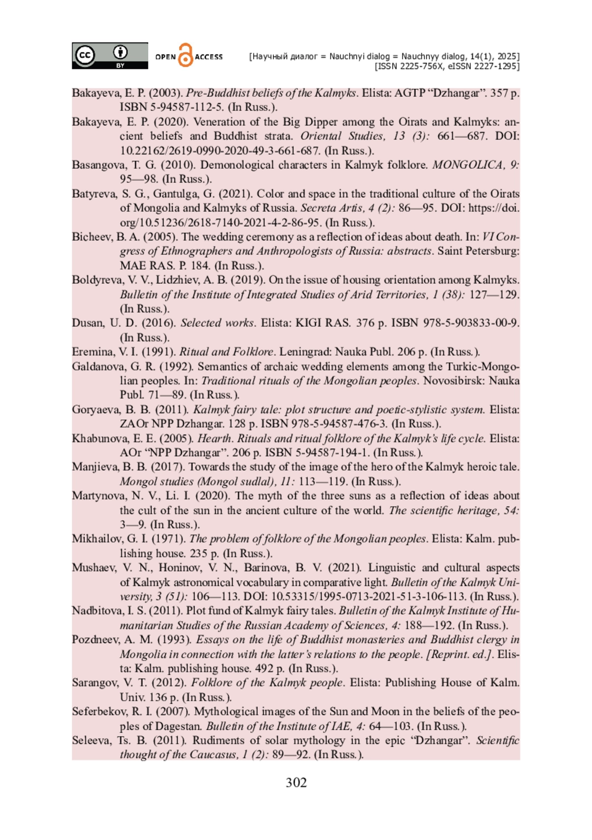 10. Бакаева Э. П. Почитание Большой Медведицы в среде ойратов и калмыков: древнейшие представления и буддийские напластования / Э. П. Бакаева // Oriental Studies. - 2020. - Т. 13. - № 3. - С. 661-687. - https://doi.org/10.22162/2619-0990-2020-49-3-661-687.