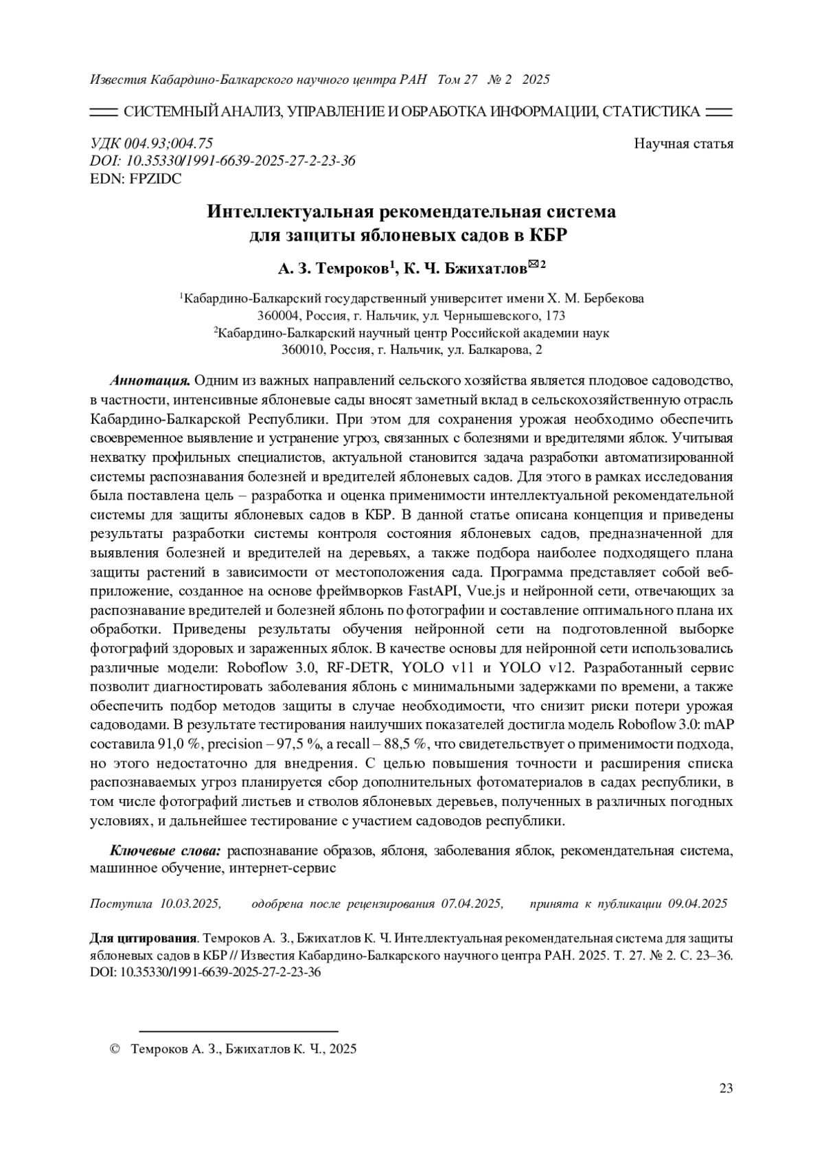 19. Темроков А. З., Тебуев М. Р., Бжихатлов К. Ч. Концепция системы прогнозирования состояния яблоневых садов // Сборник научных трудов Всероссийской научно-практической конференции “Цифровая трансформация науки и образования” с международным участием. Нальчик, 2024. С. 102-110. EDN: CSTJRH