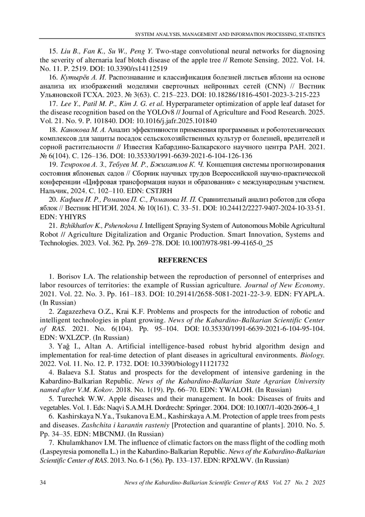 2. Загазежева О. З., Край К. Ф. Проблемы и перспективы внедрения роботизированных и интеллектуальных технологий в растениеводство // Известия Кабардино-Балкарского научного центра РАН. 2021. № 6(104). С. 95-104. DOI: 10.35330/1991-6639-2021-6-104-95-104 EDN: WXLZCP