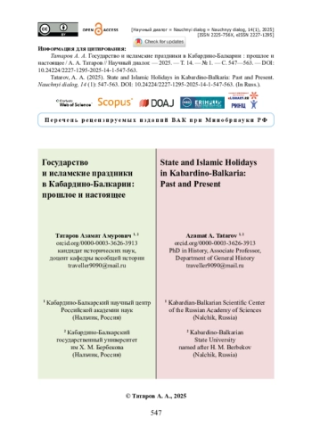 На примере Кабардино-Балкарии и на базе архивных и опубликованных данных предпринят исторический анализ государственной политики России в отношении исламских праздников на протяжении последнего столетия. Автор выделяет фактор исторического наследия, которое сформировалось в советскую эпоху. Сообщается, что в 1920-х годах исламские праздники в Кабардино-Балкарии впервые получили статус нерабочих дней. Уделено внимание периоду деятельности уполномоченных Совета по делам религиозных культов и Совета по делам религий в 1940-1980-х годах. Благодаря отчетным документам в оборот вводятся данные о тактике властей, а также количестве участников, местах проведения, гендерном составе мусульман, соблюдавших пост и участвовавших в коллективном проведении праздников. Утверждается, что для мусульман советской Кабардино-Балкарии праздники Ураза-байрам и Курбан-байрам стали институтами сохранения религиозных обрядов в условиях жесткого секуляризма. Рассмотрен период исламского возрождения в постсоветский период, в ходе которого праздники вернули себе статус нерабочих дней регионального уровня. Показано, что органы власти и местного самоуправления, политические акторы активно включаются в организацию праздников с точки зрения политики идентичности и обеспечения рамок проведения общественных мероприятий.