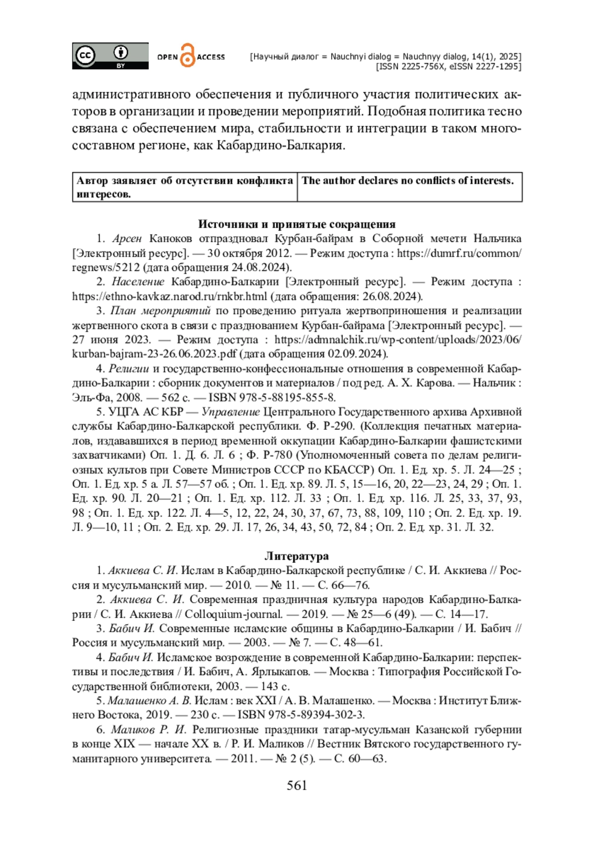 6. Аккиева С. И. Ислам в Кабардино-Балкарской республике / С. И. Аккиева // Россия и мусульманский мир. - 2010. - № 11. - С. 66-76.