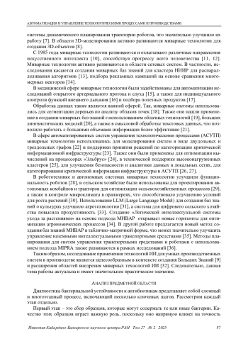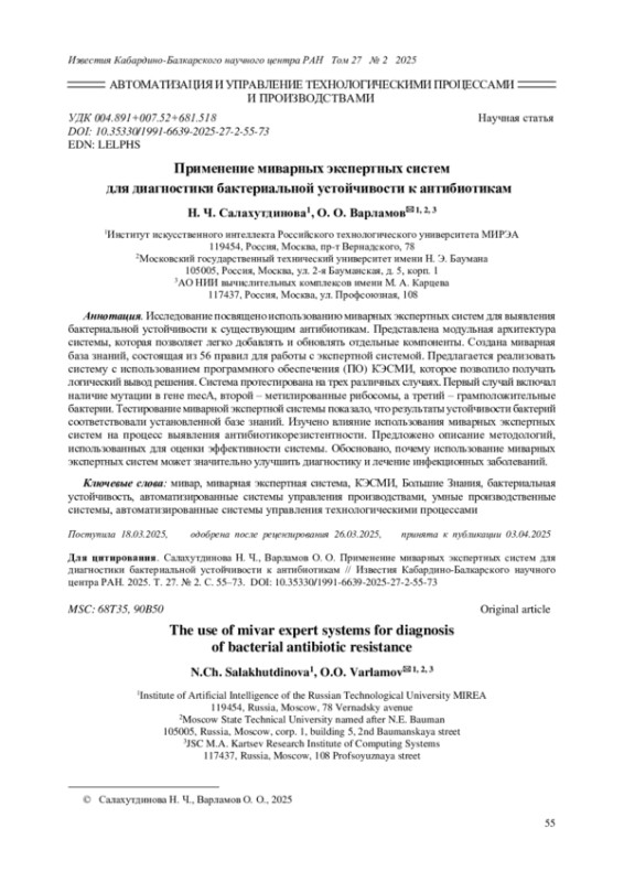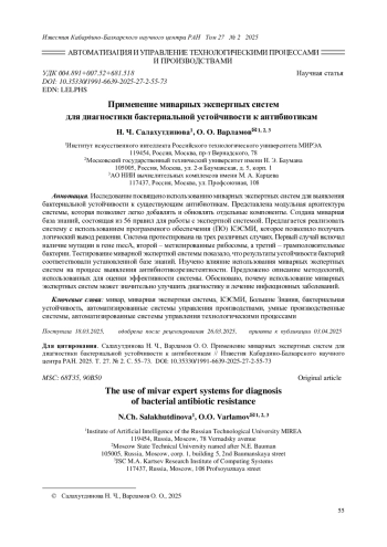 Исследование посвящено использованию миварных экспертных систем для выявления бактериальной устойчивости к существующим антибиотикам. Представлена модульная архитектура системы, которая позволяет легко добавлять и обновлять отдельные компоненты. Создана миварная база знаний, состоящая из 56 правил для работы с экспертной системой. Предлагается реализовать систему с использованием программного обеспечения (ПО) КЭСМИ, которое позволило получать логический вывод решения. Система протестирована на трех различных случаях. Первый случай включал наличие мутации в гене mecA, второй - метилированные рибосомы, а третий - грамположительные бактерии. Тестирование миварной экспертной системы показало, что результаты устойчивости бактерий соответствовали установленной базе знаний. Изучено влияние использования миварных экспертных систем на процесс выявления антибиотикорезистентности. Предложено описание методологий, использованных для оценки эффективности системы. Обосновано, почему использование миварных экспертных систем может значительно улучшить диагностику и лечение инфекционных заболеваний.