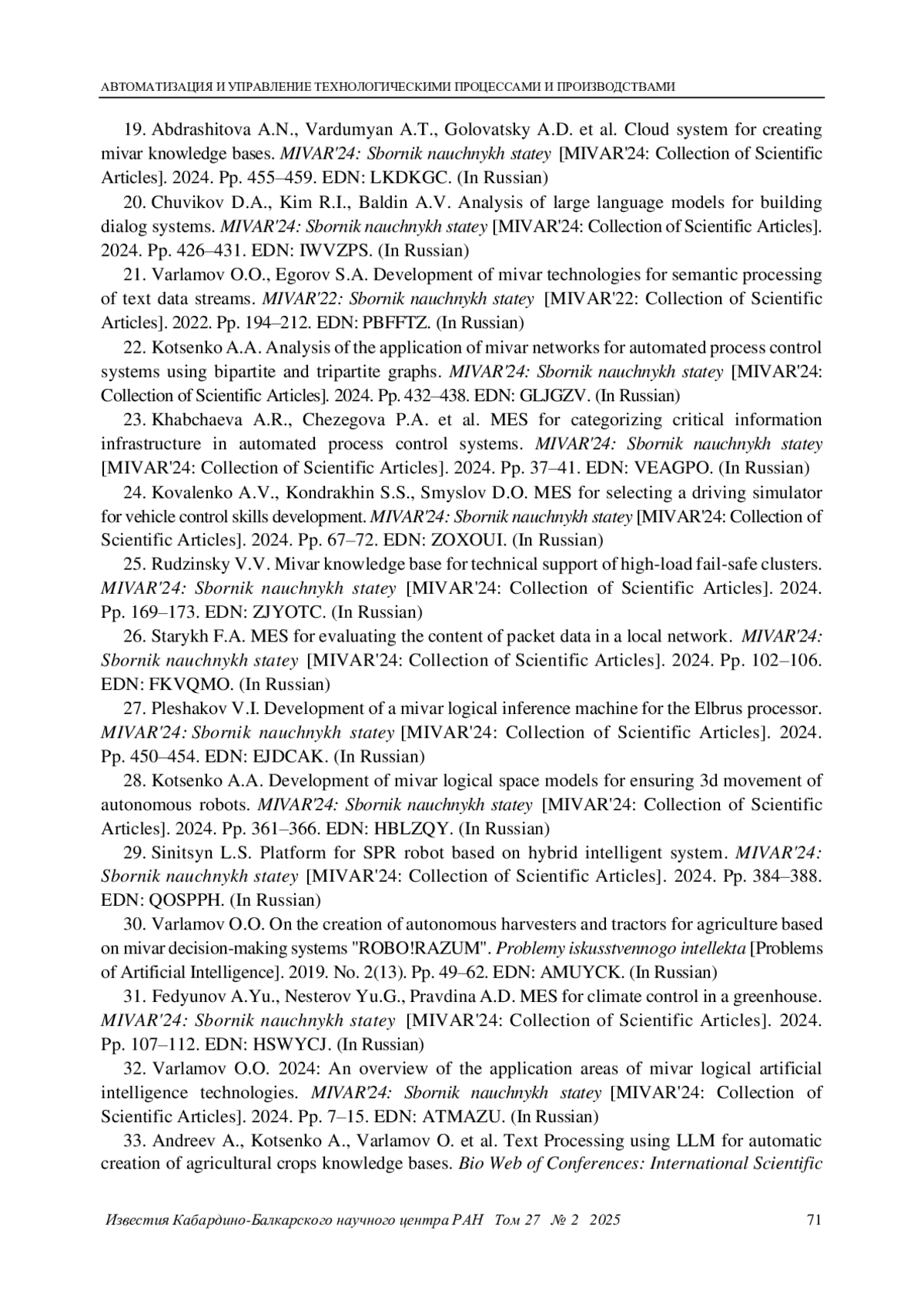 32. 	Варламов О. О. 2024: обзор областей применения миварных технологий ЛИИ. МИВАР’24: Сборник научных статей. 2024. С. 7-15. EDN: ATMAZU