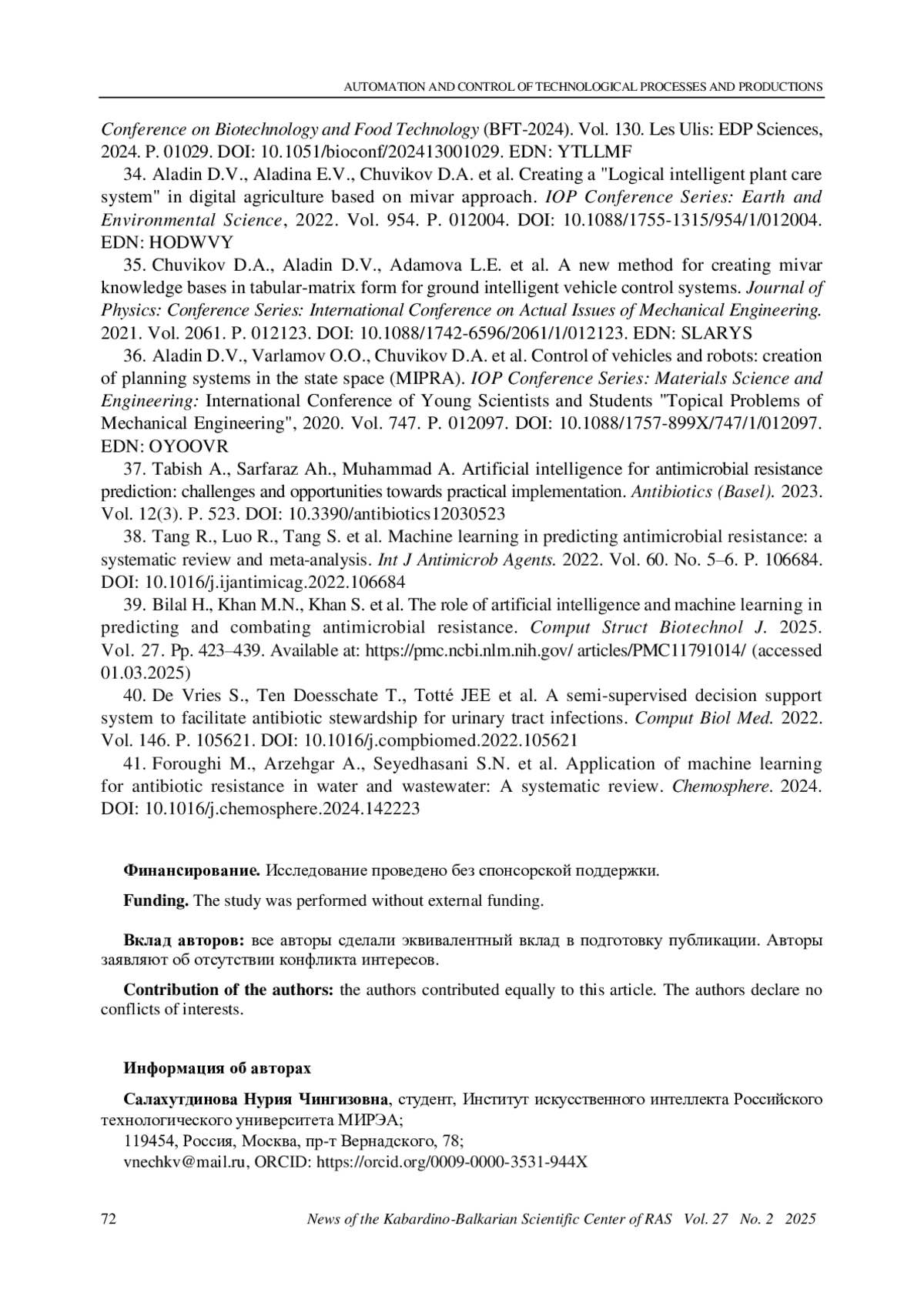 37. 	Tabish A., Sarfaraz Ah., Muhammad A. Artificial Intelligence for Antimicrobial Resistance Prediction: Challenges and Opportunities towards Practical Implementation // Antibiotics (Basel). 2023. Vol. 12. No. 3. P. 523. DOI: 10.3390/antibiotics12030523