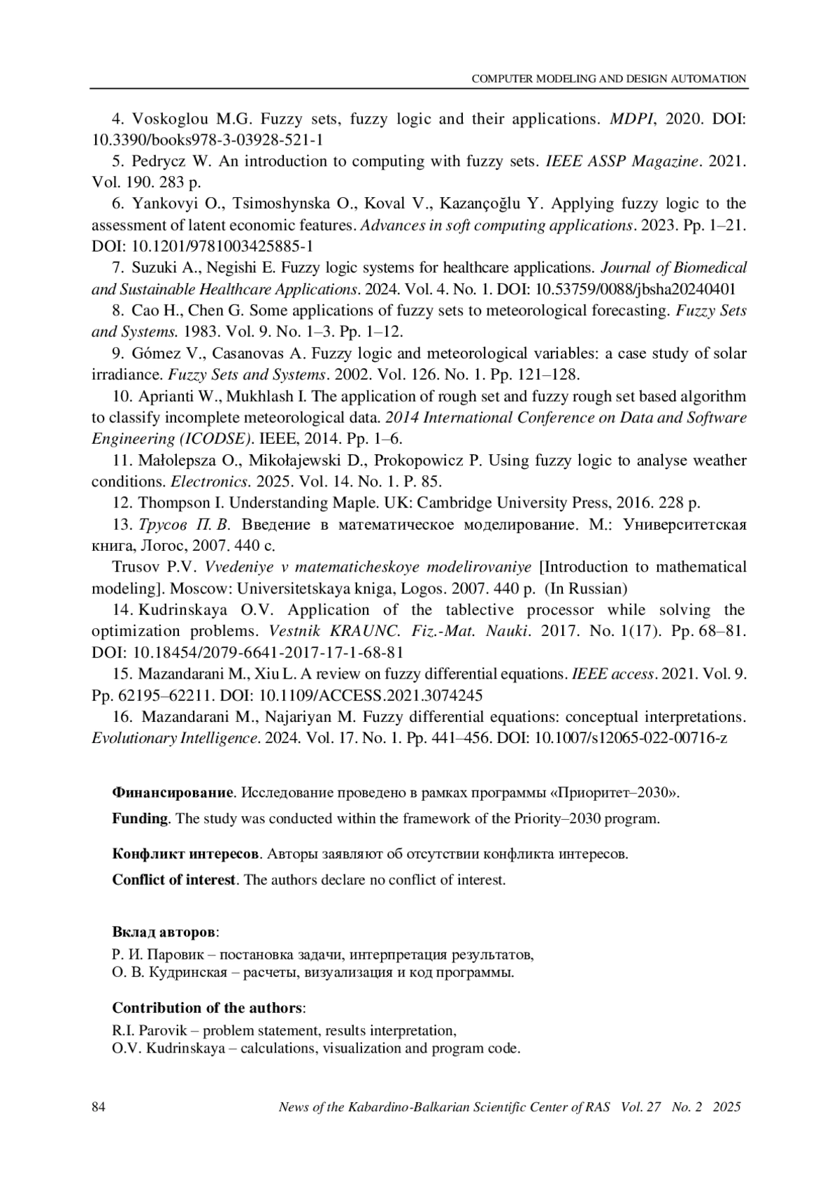 9. Gómez V., Casanovas A. Fuzzy logic and meteorological variables: a case study of solar irradiance. Fuzzy Sets and Systems. 2002. Vol. 126. No. 1. Pp. 121-128. EDN: ATTJKH