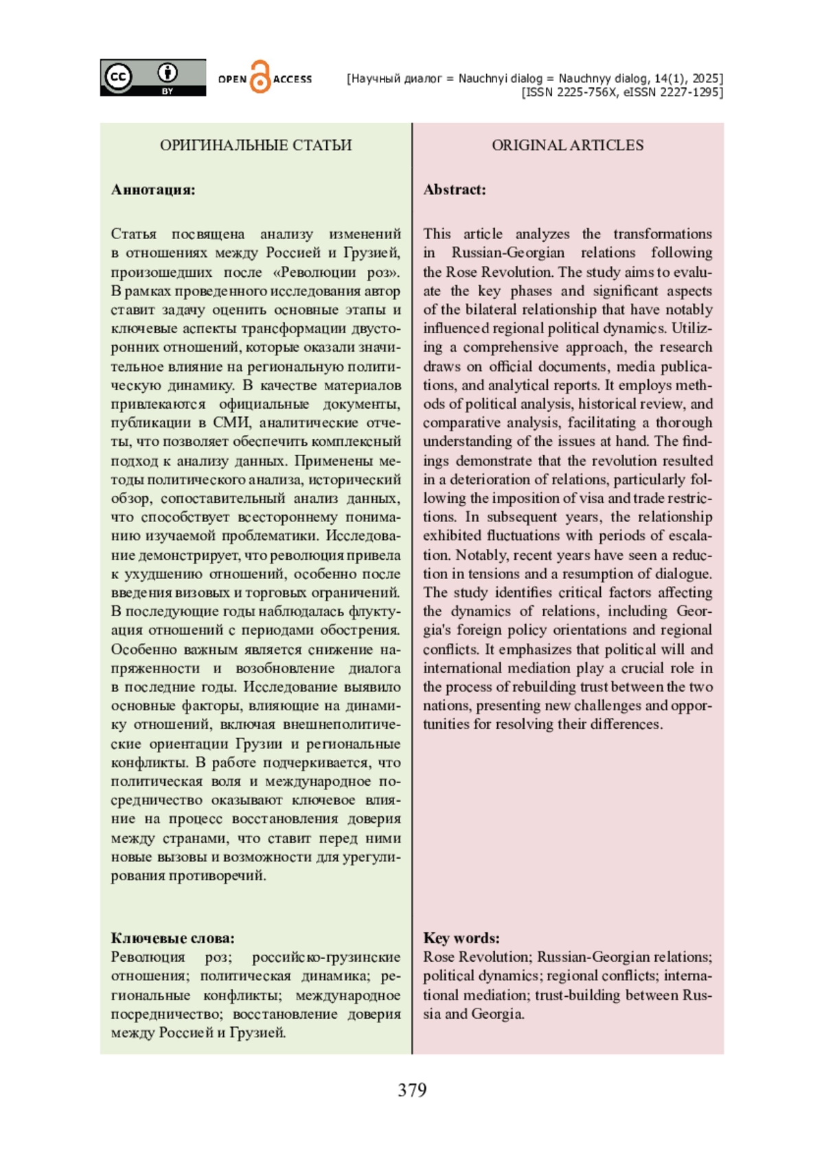 Статья посвящена анализу изменений в отношениях между Россией и Грузией, произошедших после «Революции роз». В рамках проведенного исследования автор ставит задачу оценить основные этапы и ключевые аспекты трансформации двусторонних отношений, которые оказали значительное влияние на региональную политическую динамику. В качестве материалов привлекаются официальные документы, публикации в СМИ, аналитические отчеты, что позволяет обеспечить комплексный подход к анализу данных. Применены методы политического анализа, исторический обзор, сопоставительный анализ данных, что способствует всестороннему пониманию изучаемой проблематики. Исследование демонстрирует, что революция привела к ухудшению отношений, особенно после введения визовых и торговых ограничений. В последующие годы наблюдалась флуктуация отношений с периодами обострения. Особенно важным является снижение напряженности и возобновление диалога в последние годы. Исследование выявило основные факторы, влияющие на динамику отношений, включая внешнеполитические ориентации Грузии и региональные конфликты. В работе подчеркивается, что политическая воля и международное посредничество оказывают ключевое влияние на процесс восстановления доверия между странами, что ставит перед ними новые вызовы и возможности для урегулирования противоречий.