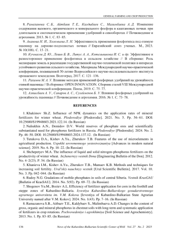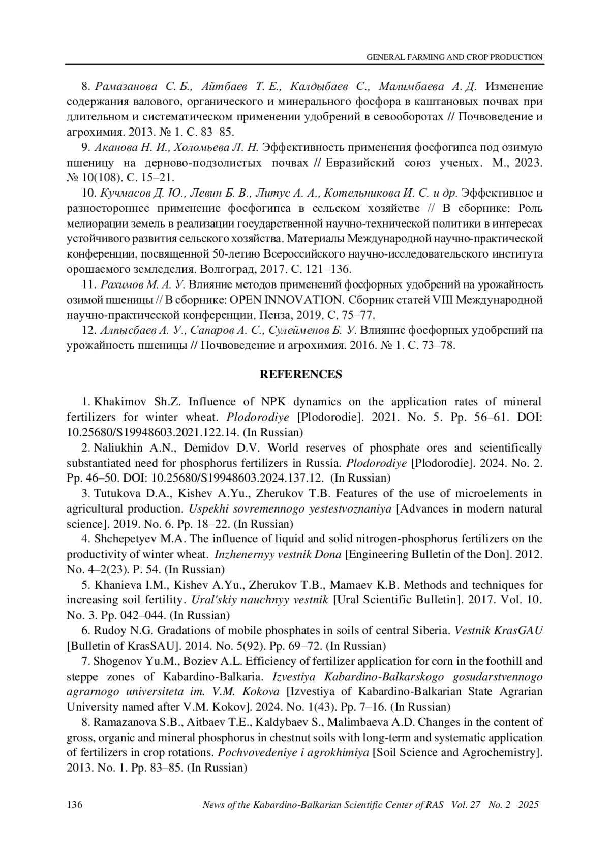 1. 	Хакимов Ш. З. Влияние динамики NPK на дозы внесения минеральных удобрений под озимую пшеницу // Плодородие. 2021. № 5. С. 56-61. DOI: 10.25680/S19948603.2021.122.14 EDN: HQDXZA