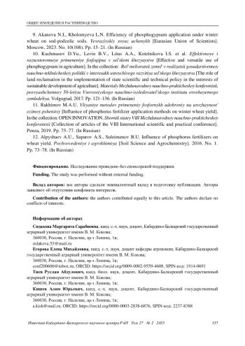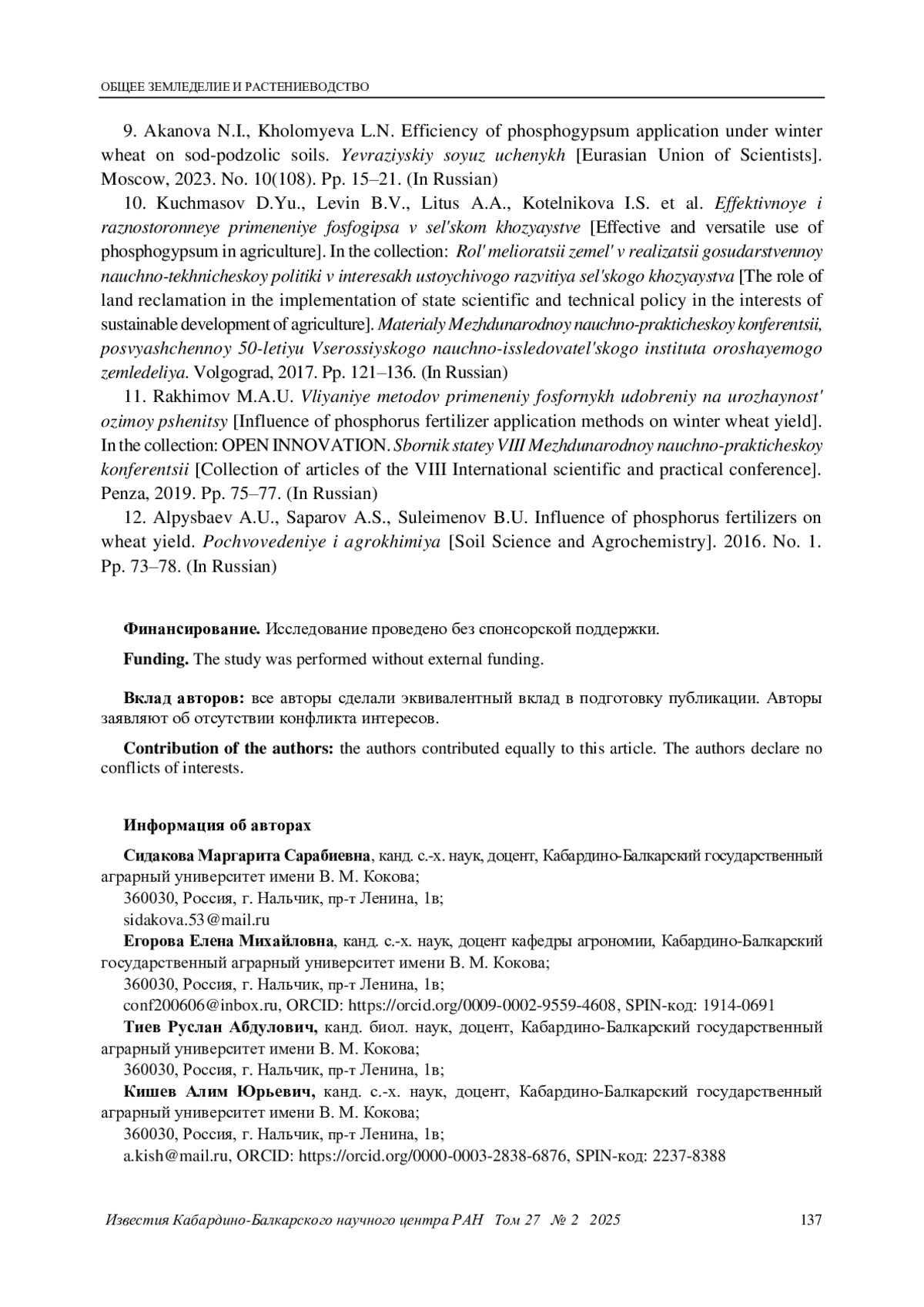 9. 	Аканова Н. И., Холомьева Л. Н. Эффективность применения фосфогипса под озимую пшеницу на дерново-подзолистых почвах // Евразийский союз ученых. М., 2023. № 10(108). С. 15-21. EDN: DSWRNV