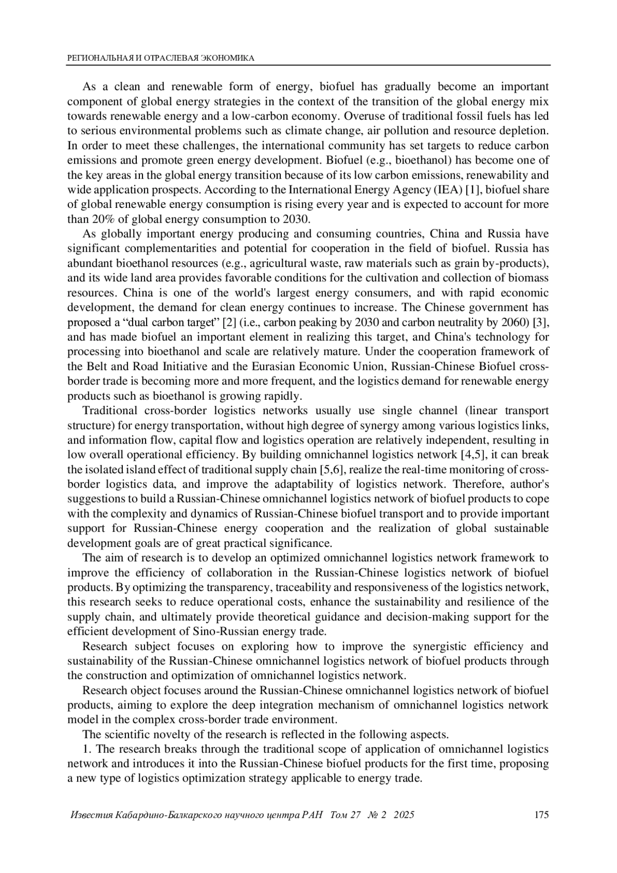 Цель исследования. Цель исследования заключается в разработке модели оптимизации омниканальной логистической сети для биотоплива, основанной на методах анализа данных и искусственного интеллекта. Это позволяет создать эффективный инструмент для управления российско-китайскими логистическими сетями в трансграничном контексте.