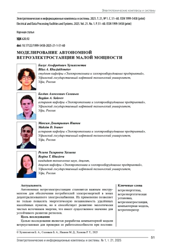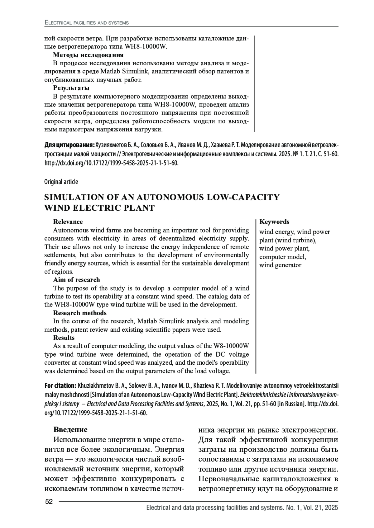 Актуальность Автономные ветроэлектростанции становятся важным инструментом для обеспечения потребителей электроэнергией в зонах децентрализованного электроснабжения. Их применение позволяет не только повысить энергетическую независимость удалённых населённых пунктов, но и способствует развитию экологически чистых источников энергии, что имеет существенное значение для устойчивого развития регионов. Цель исследования Целью исследования является разработка компьютерной модели ветроустановки для проверки ее работоспособности при постоянной скорости ветра. При разработке использованы каталожные данные ветрогенератора типа WH8-10000W. Методы исследования В процессе исследования использованы методы анализа и моделирования в среде Matlab Simulink, аналитический обзор патентов и опубликованных научных работ. Результаты В результате компьютерного моделирования определены выходные значения ветрогенератора типа WH8-10000W, проведен анализ работы преобразователя постоянного напряжения при постоянной скорости ветра, определена работоспособность модели по выходным параметрам напряжения нагрузки.