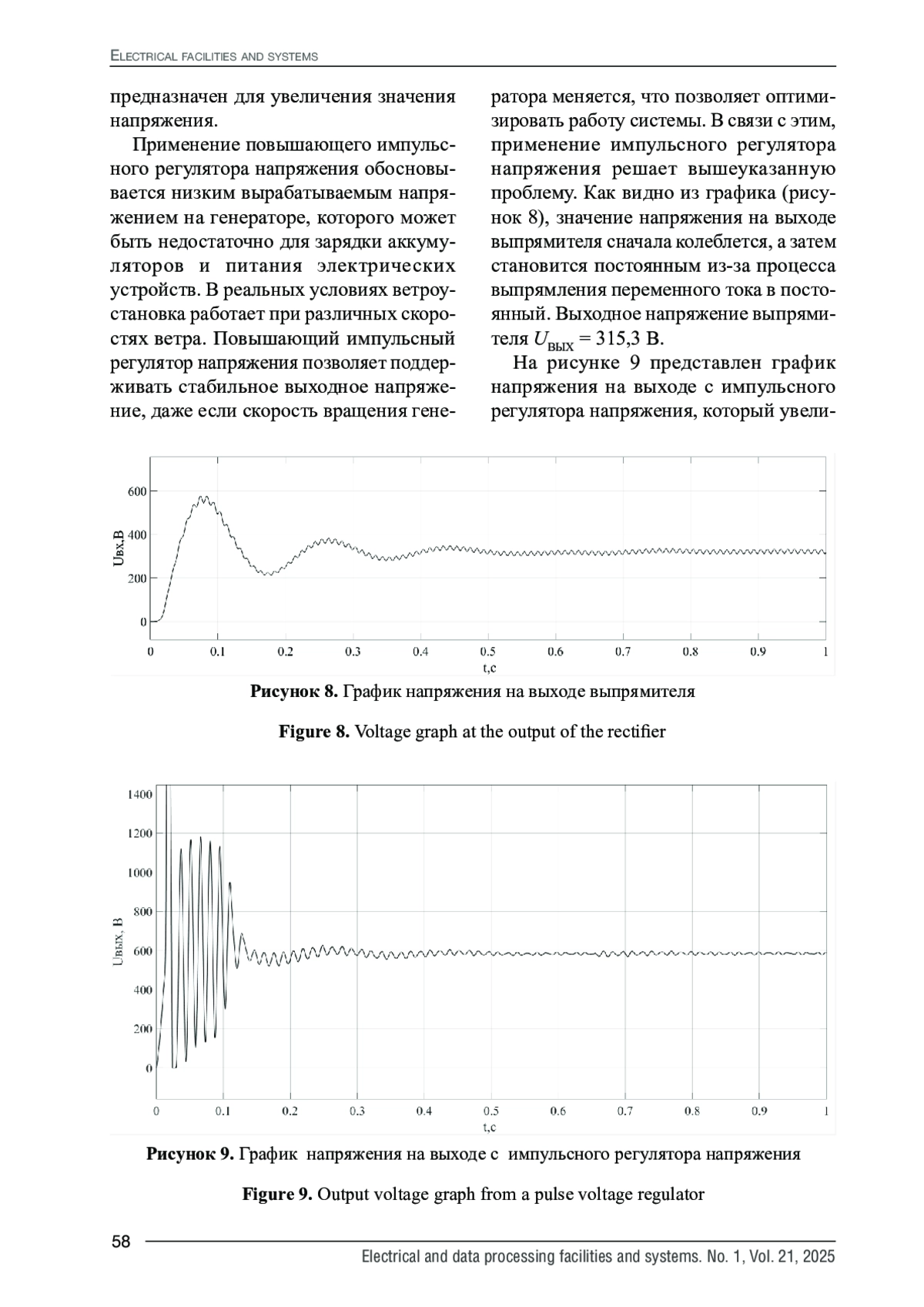 Актуальность Ветроэнергетика в Республике Башкортостан, как и в любом другом регионе, имеет свои недостатки. Башкортостан не относится к регионам с высоким уровнем ветровой энергии. Согласно данным метеорологических станций, среднегодовая скорость ветра на высоте до 10 м варьируется от 1,6 до 4,4 м/с. Номинальная скорость ветра, при которой ветрогенератор вырабатывает максимальную мощность, находится в диапазоне 12-15 м/с. Для преодоления проблемы выработки электроэнергии в районах с пониженной скоростью ветра, где потенциал ветровой энергии невелик, необходимы новые технические решения. Одно из них предложено в данной статье в виде ветроустановки на базе двух пятифазных магнитоэлектрических генераторов со стабилизацией напряжения. Цель исследования Исследовать возможность стабилизации выходного напряжения при низких скоростях ветра в ветроустановке на базе двух пятифазных магнитоэлектрических генераторов. Методы исследования Моделирование режимов работы при низких и нормальных скоростях ветра ветроустановки на базе двух пятифазных магнитоэлектрических генераторов в пакете прикладных программ Matlab (Simscape). Результаты Проведено исследование режимов работы при низких и нормальных скоростях ветра ветроустановки на базе двух пятифазных магнитоэлектрических генераторов в пакете прикладных программ Matlab (Simscape). Подобный метод регулирования напряжения может обеспечить возможность стабилизировать напряжение и сохранять высокую эффективность на приемлемом уровне в более широком диапазоне низких и нормальных скоростей ветра.