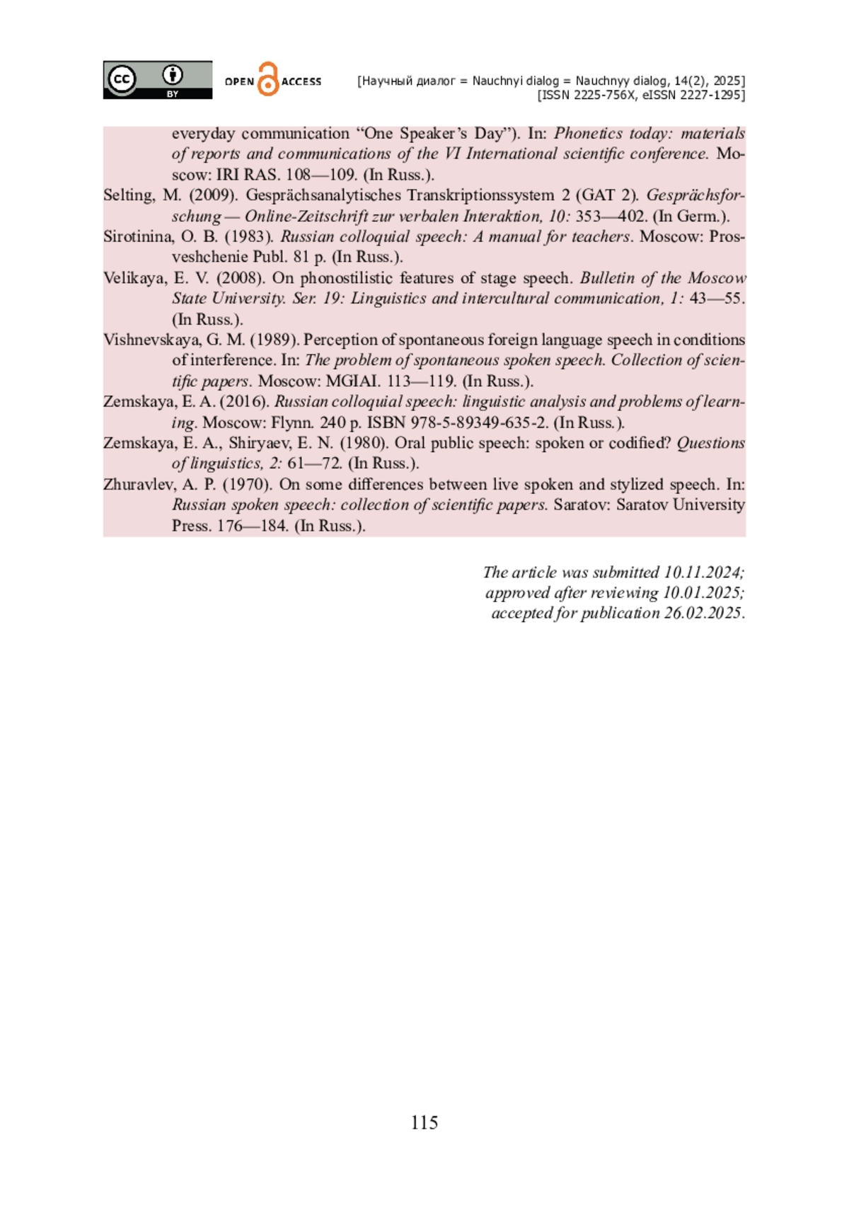 9. Исаева А. А. Маркеры дифференциации спонтанной и подготовленной звучащей речи / А. А. Исаева // Вестник ВГУ. - Серия : Лингвистика и межкультурная коммуникация. - 2020. - № 4. - С. 37-48. - https://doi.org/10.17308/ lic.2020.4 /3078.
