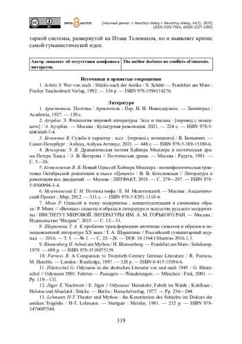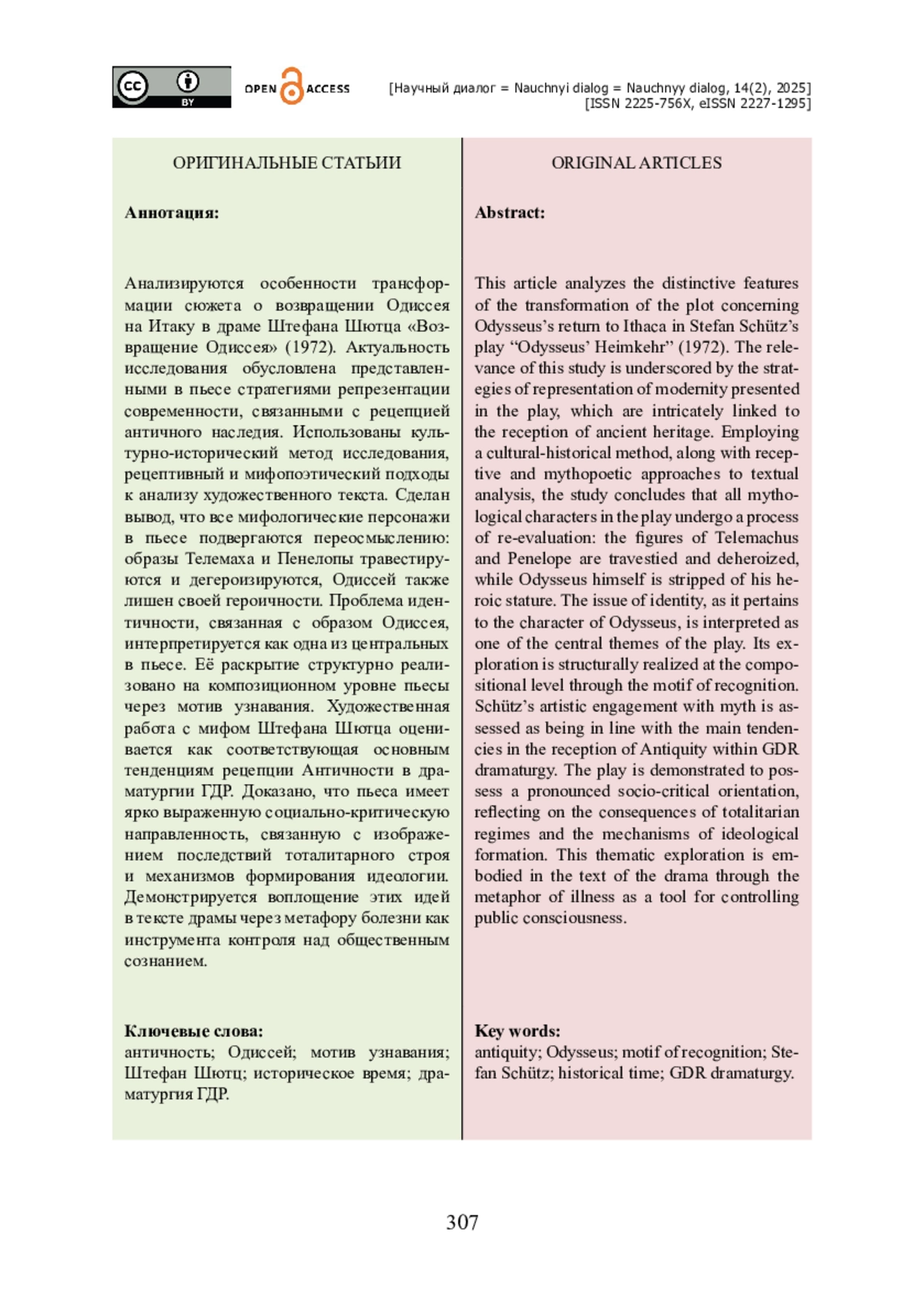 ФРОЛОВА А. С. РЕЦЕПЦИЯ АНТИЧНОГО СЮЖЕТА ОБ ОДИССЕЕ В ДРАМЕ ШТЕФАНА ШЮТЦА «ВОЗВРАЩЕНИЕ ОДИССЕЯ» («ODYSSEUS´ HEIMKEHR») // НАУЧНЫЙ ДИАЛОГ. 2025. ТОМ 14, № 2