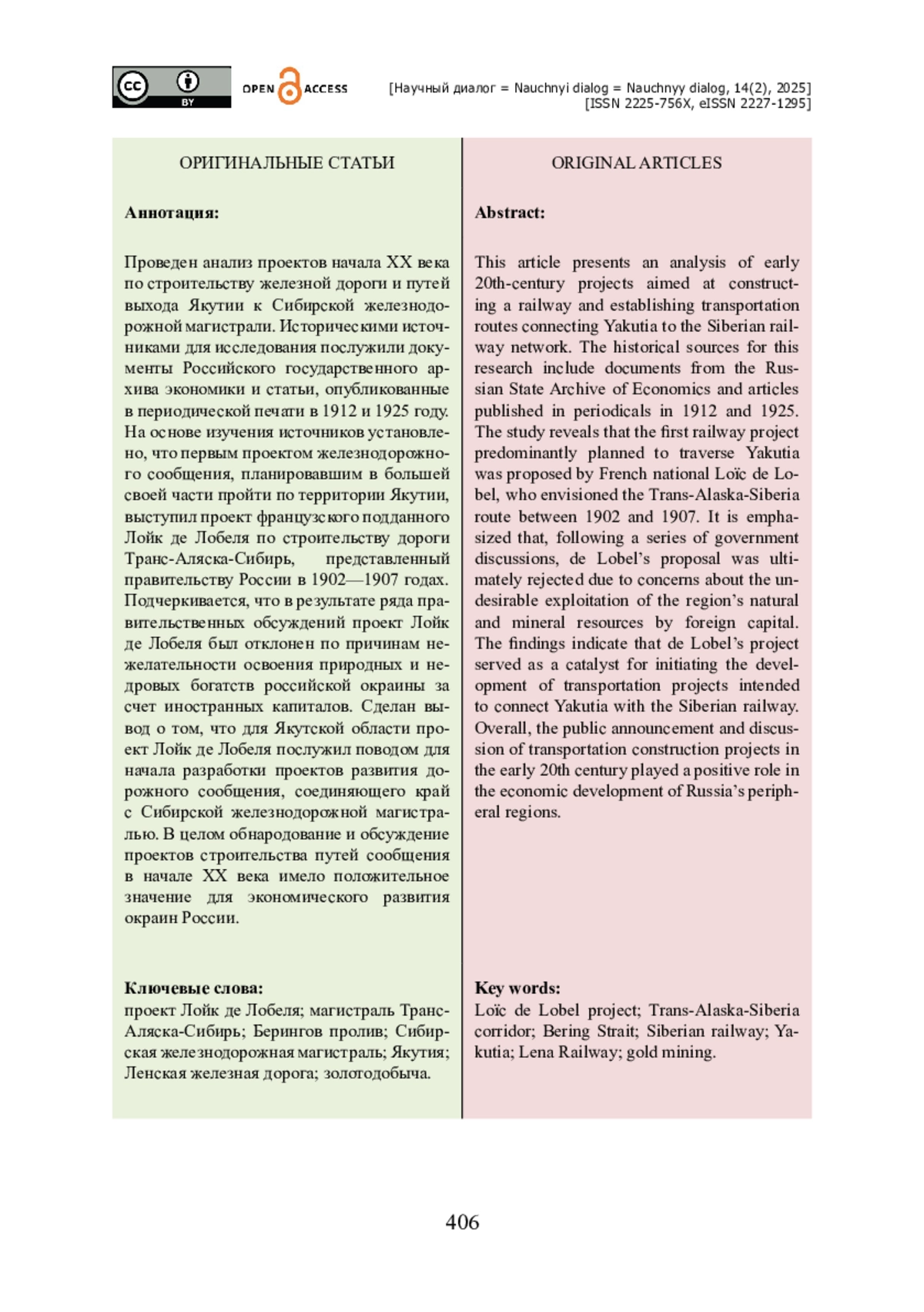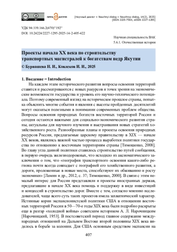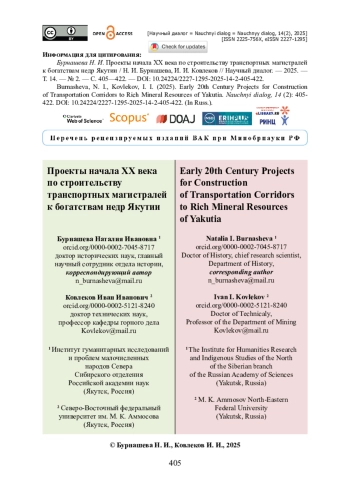 БУРНАШЕВА Н. И., КОВЛЕКОВ И. И. ПРОЕКТЫ НАЧАЛА ХХ ВЕКА ПО СТРОИТЕЛЬСТВУ ТРАНСПОРТНЫХ МАГИСТРАЛЕЙ К БОГАТСТВАМ НЕДР ЯКУТИИ // НАУЧНЫЙ ДИАЛОГ. 2025. ТОМ 14, № 2
