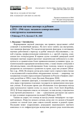 Рассматривается процесс формирования германской научной диаспоры за рубежом после прихода к власти нацистов в 1933 году. Анализируются предпосылки масштабной эмиграции научных кадров из страны, прежде всего, принятие 7 апреля 1933 года закона о восстановлении статуса государственных служащих. Рассматривается уникальный исторический прецедент учреждения организации взаимопомощи научных работников, вынужденно оказавшихся в эмиграции, — Чрезвычайной ассоциации немецких ученых за рубежом. Делается акцент на значении личной инициативы видного патолога Филиппа Шварца и его ближайших соратников в создании названной структуры. Изучаются механизм и особенности ее работы, ключевые географические направления деятельности и международные связи. Проанализированы материалы специального архивного фонда британского Общества защиты науки и образования. Проведена оценка эффективности работы ассоциации за тринадцатилетний период ее существования — с 1933 по 1946 годы. Сделан вывод, что основанная Филиппом Шварцем организация сыграла важную роль в институционализации немецкой научной диаспоры в соответствующий период и помогла почти 1800 ученым спастись от преследования нацистских властей. Отмечена значимость наследия ассоциации не только как исторического эпизода, но и как одного из образцов успешного «научно-диаспорального строительства» в экстремальных условиях.