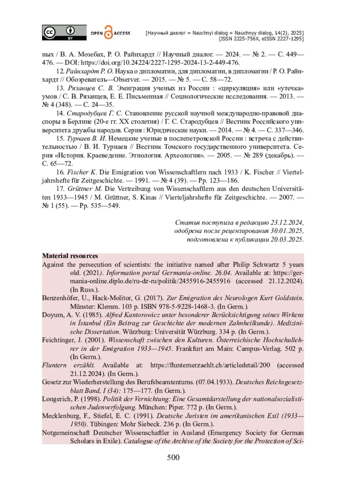 16. Fischer K. Die Emigration von Wissenschaftlern nach 1933 / K. Fischer // Vierteljahrshefte für Zeitgeschichte. - 1991. - № 4 (39). - Pp. 123-186.