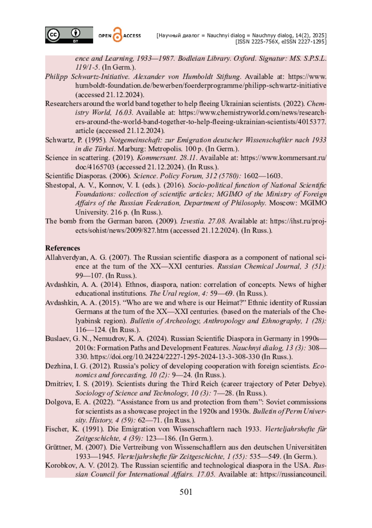 4. Буслаев Г. Н. Российская научная диаспора в Германии в 1990-2010-е годы : пути формирования и особенности развития / Г. Н. Буслаев, К. А. Немудров // Научный диалог. - 2024. - № 3. - С. 308-330. - https://doi.org/10.24224/2227-1295-2024-13-3-308-330.