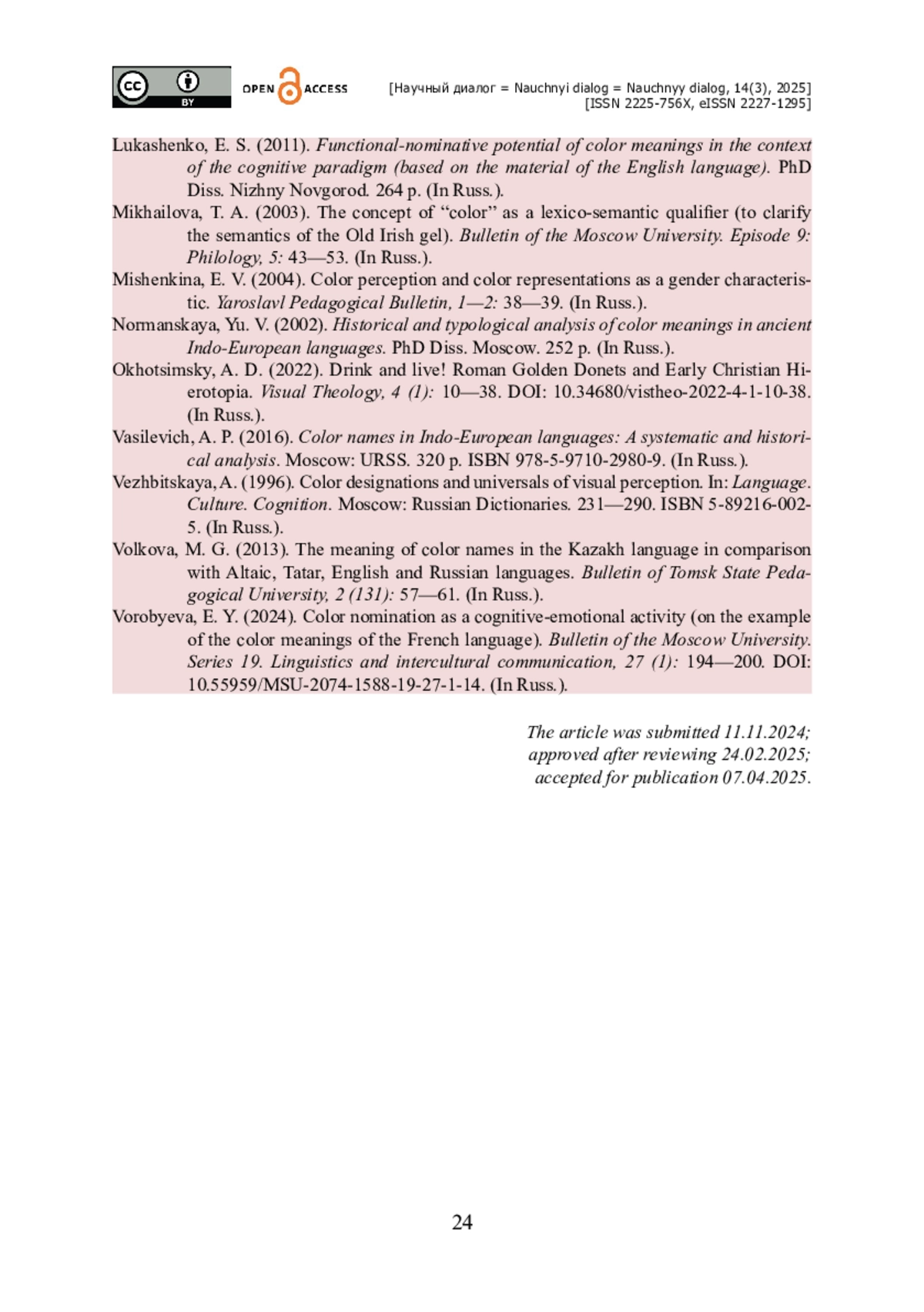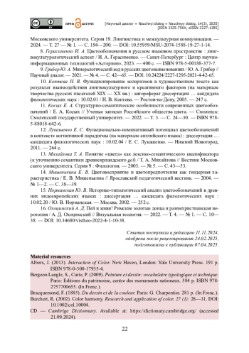 7. Воробьева Е. Ю. Цветовая номинация как когнитивно-эмоциональная деятельность (на примере цветообозначений французского языка) / Е. Ю. Воробьева // Вестник Московского университета. Серия 19. Лингвистика и межкультурная коммуникация. - 2024. - Т. 27 - № 1. - C. 194-200. - https://doi.org/10.55959/MSU-2074-1588-19-27-1-14.