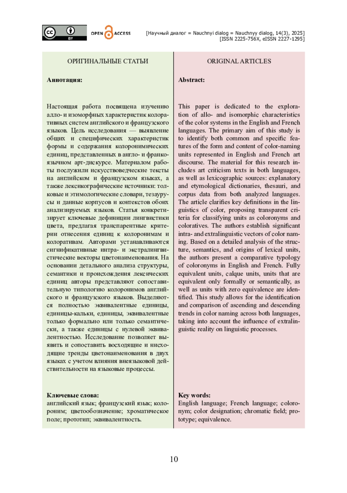 Настоящая работа посвящена изучению алло- и изоморфных характеристик колоративных систем английского и французского языков. Цель исследования — выявление общих и специфических характеристик формы и содержания колоронимических единиц, представленных в англо- и франко-язычном арт-дискурсе. Материалом работы послужили искусствоведческие тексты на английском и французском языках, а также лексикографические источники: толковые и этимологические словари, тезаурусы и данные корпусов и контекстов обоих анализируемых языков. Статья конкретизирует ключевые дефиниции лингвистики цвета, предлагая транспарентные критерии отнесения единиц к колоронимам и колоративам. Авторами устанавливаются сигнификативные интра- и экстралингвистические векторы цветонаименования. На основании детального анализа структуры, семантики и происхождения лексических единиц авторы представляют сопоставительную типологию колоронимов английского и французского языков. Выделяются полностью эквивалентные единицы, единицы-кальки, единицы, эквивалентные только формально или только семантически, а также единицы с нулевой эквивалентностью. Исследование позволяет выявить и сопоставить восходящие и нисходящие тренды цветонаименования в двух языках с учетом влияния внеязыковой действительности на языковые процессы.