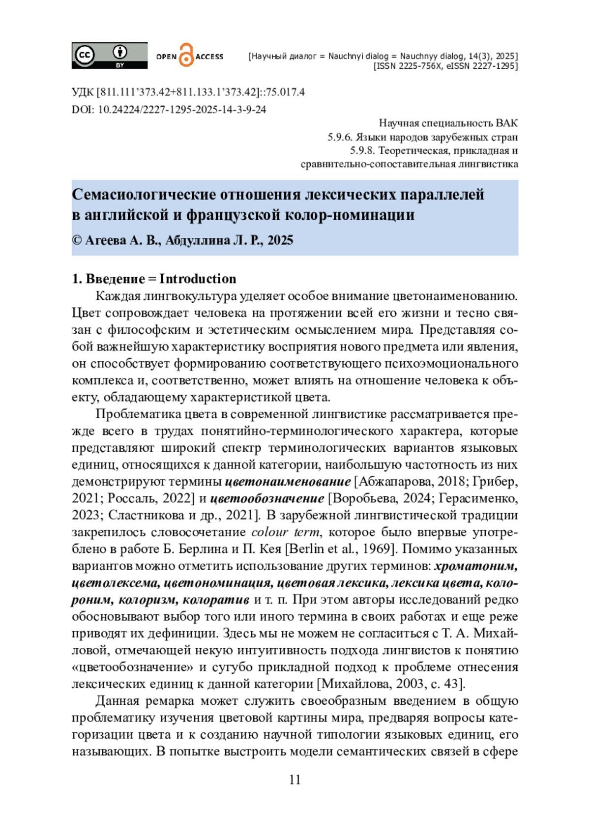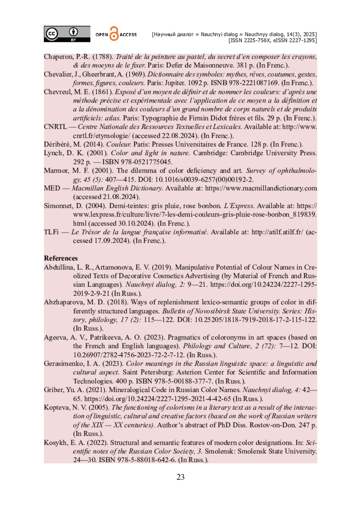 3. Агеева А. В. Прагматика колоронимов в арт-пространствах (на материале французского и английского языков) / А. В. Агеева, А. О. Патрикеева // Филология и культура. - 2023. - № 2 (72). - С. 7-12. - https://doi.org/10.26907/2782-4756-2023-72-2-7-12.