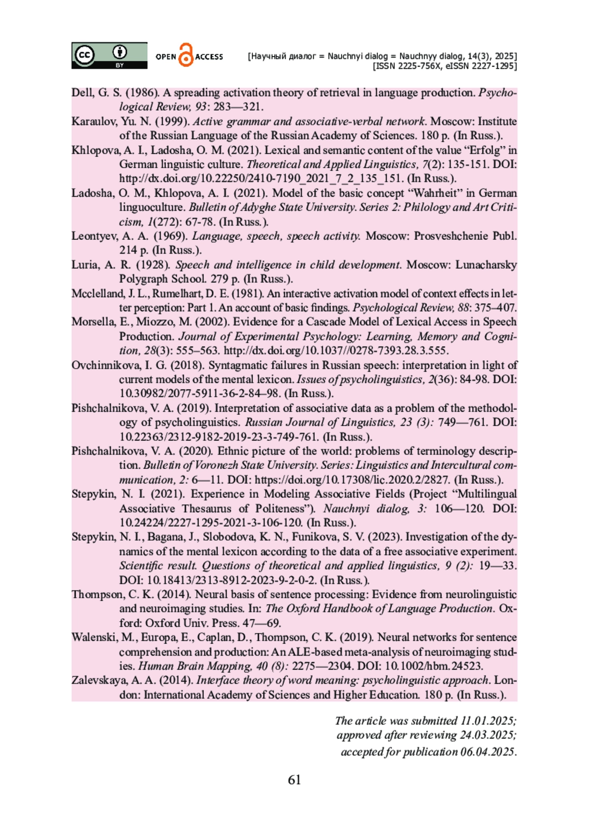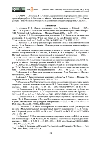 10. Пищальникова В. А. Интерпретация ассоциативных данных как проблема методологии психолингвистики / В. А. Пищальникова // Russian Journal of Linguistics. - 2019. - Т. 23. - № 3. - С. 749-761. - https://doi.org/10.22363/2312-9182-2019-23-3-749-761.