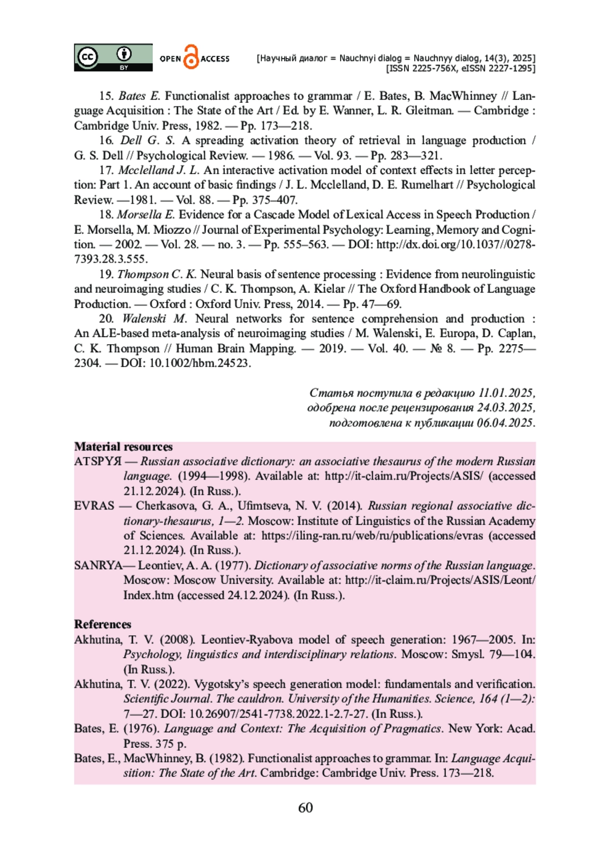 9. Овчинникова И. Г. Синтагматические сбои в русской речи : интерпретация в свете актуальных моделей ментального лексикона / И. Г. Овчинникова // Вопросы психолингвистики. - 2018. - № 2 (36). - С. 84-98. - https://doi.org/10.30982/2077-5911-36-2-84-98.