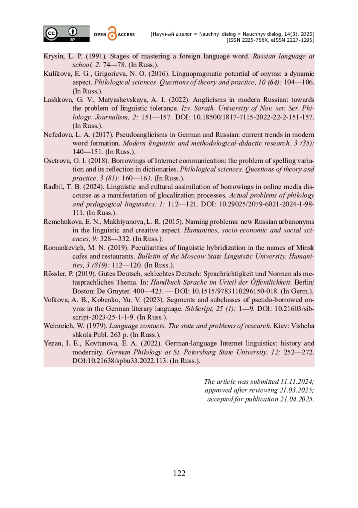 3. Волкова А. Б. Сегменты и субклассы псевдозаимствованных онимов в немецком литературном языке / А. Б. Волкова, Ю. В. Кобенко // СибСкрипт. - 2023. - Т. 25. - № 1. - С. 1-9. - https://doi.org/10.21603/sibscript-2023-25-1-1-9.