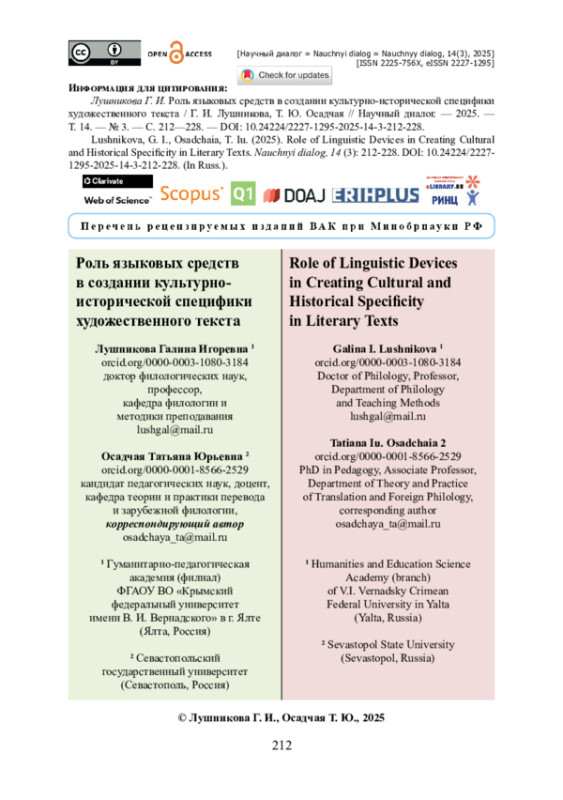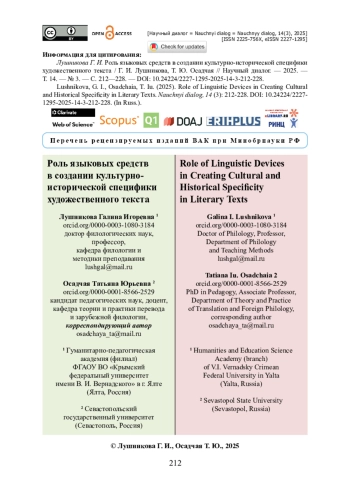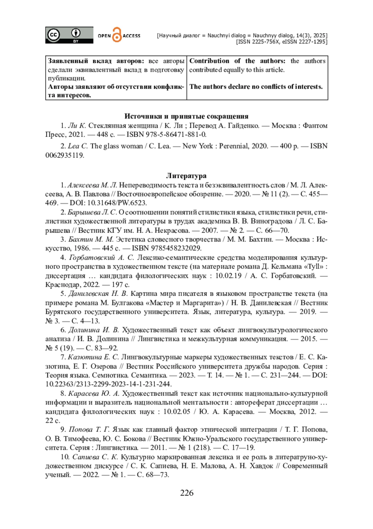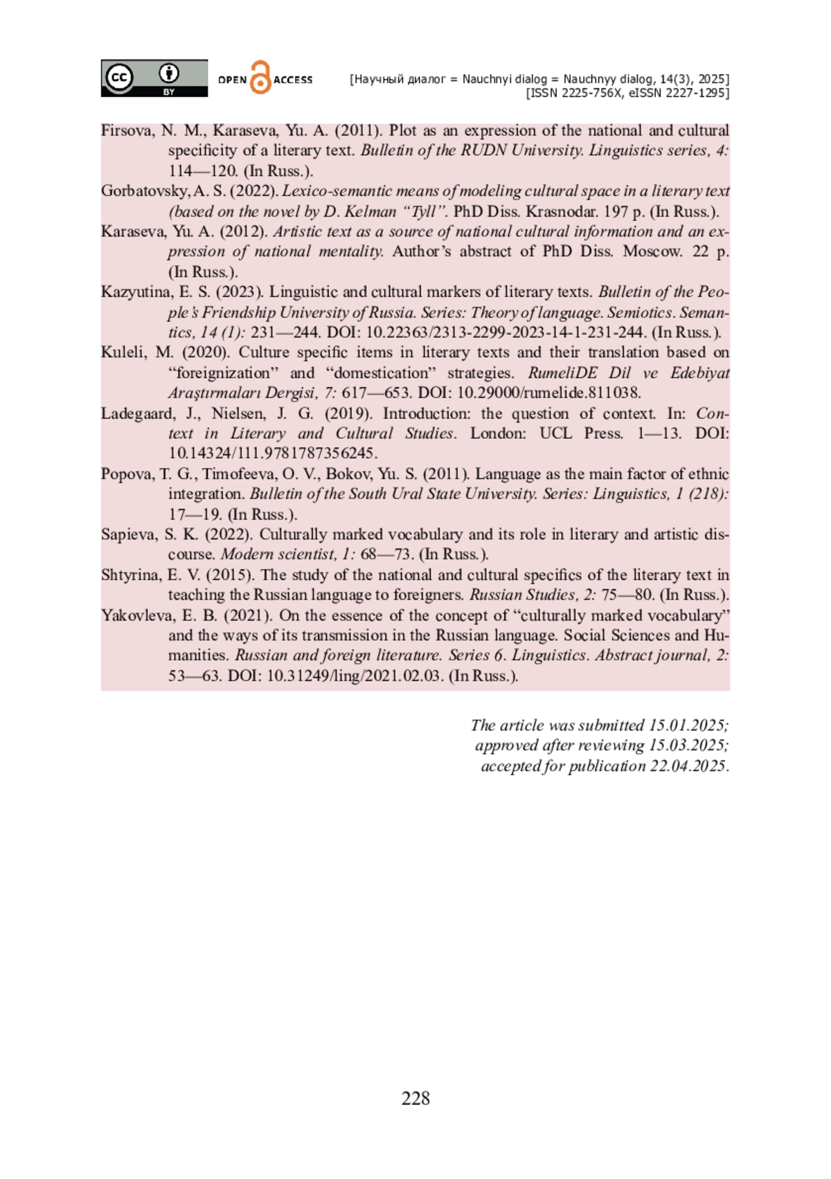 7. Казютина Е. С. Лингвокультурные маркеры художественных текстов / Е. С. Казютина, Е. Г. Озерова // Вестник Российского университета дружбы народов. Серия : Теория языка. Семиотика. Семантика. - 2023. - Т. 14. - № 1. - С. 231-244. - https://doi.org/10.22363/2313-2299-2023-14-1-231-244.