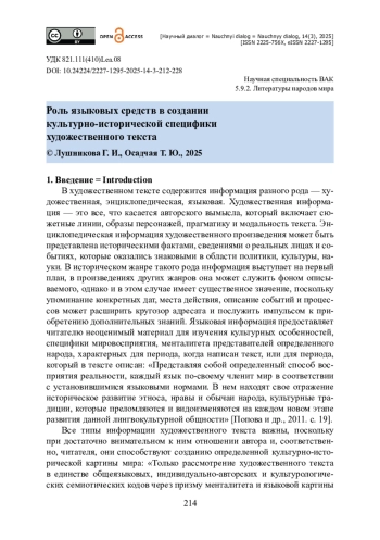 Статья посвящена изучению языковых средств, используемых в художественном тексте для создания культурно-исторического колорита. Материалы для анализа извлечены из романа современной британской писательницы Кэролайн Ли «Стеклянная женщина», который ранее не подвергался филологическому изучению, что определяет новизну данной работы. Цель статьи — выявить языковые средства создания национально-культурной специфики Исландии XVII века, представленной в данном произведении, определить их функции и значимость в воплощении авторского замысла. Проанализированы следующие культурно маркированные единицы: безэквивалентная лексика, онимы, лексические единицы библейского и языческого текстов, паремии, пейзажная лексика. Авторы считают, что изучение художественного текста как формы существования и воплощения культуры народа является одним из актуальных направлений современной лингвистики. Использованы лингвокультурологический, лексико-семантический и концептуальный методы анализа художественного текста. Авторы приходят к выводу о том, что лингвокультуремы выполняют гносеологическую функцию; способствуют трансляции определенной национальной картины мира; создают представления об уникальной идентичности исландцев и их системе ценностей; содействуют налаживанию лингвокультурных связей между коммуникантами (автор — персонажи — читатель) и формированию ценностных универсалий в сознании читателя.