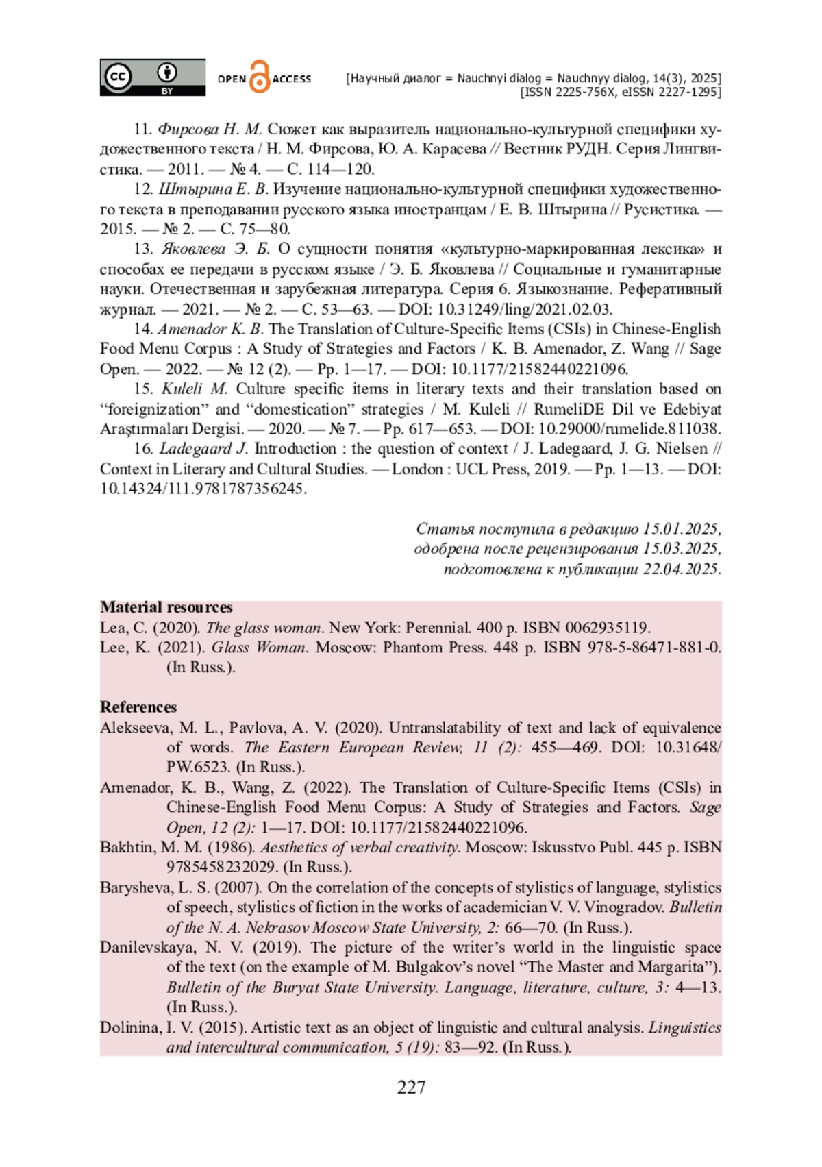13. Яковлева Э. Б. О сущности понятия «культурно-маркированная лексика» и способах ее передачи в русском языке / Э. Б. Яковлева // Социальные и гуманитарные науки. Отечественная и зарубежная литература. Серия 6. Языкознание. Реферативный журнал. - 2021. - № 2. - С. 53-63. - https://doi.org/10.31249/ling/2021.02.03.