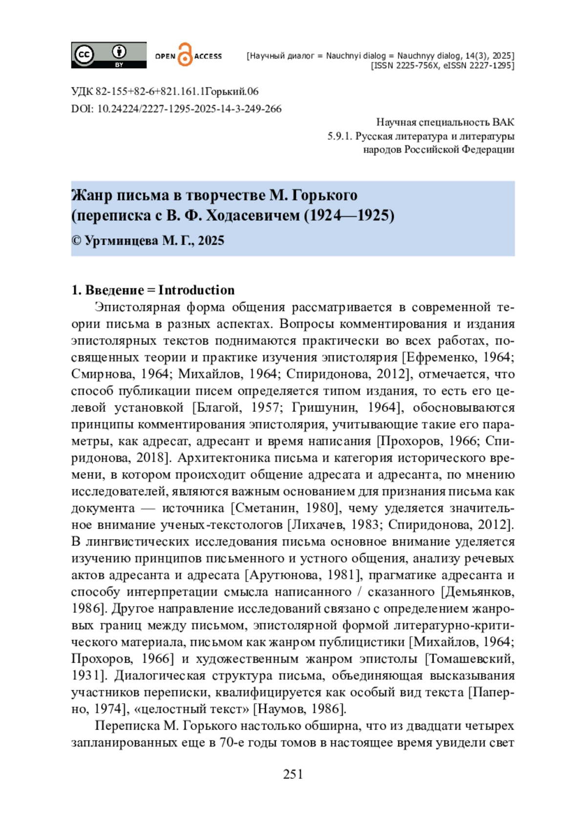 Статья посвящена исследованию особенностей жанра письма в эпистолярном наследии М. Горького 1924—1925 годов. Это период наиболее активного творческого общения с В. Ходасевичем, видным представителем русской культурной эмиграции. Цель статьи — показать, что письма М. Горького В. Ходасевичу — творческий акт, рождающийся в процессе недолгого эпистолярного общения корреспондентов. Представлены результаты анализа, в ходе которого было доказано, что рассматриваемые письма Горького представляют собой индивидуальную жанровую структуру. Представлена авторская разработка исследования жанра как динамической структуры, обладающей как устойчивыми сюжетно-композиционными приемами, так и вариативными способами апелляции к адресату, отражающими индивидуальность творческого процесса создания письма. В исследовании показано, что комплекс использованных в письмах Горького способов создания текста обусловлен особенностями личности участников, характером эпохи и обстоятельствами, в которых осуществляется переписка. Установлены устойчивые формулы эпистолярного общения М. Горького с В. Ходасевичем, сложившиеся в ходе обсуждения вопросов публикационной политики журнала «Беседа». Новизна исследования определяется доказательством многофункциональности этикетных приемов письменного диалога, ассоциативной обусловленностью сюжетной динамики, использованием различных видов сверхтекста, ориентацией на восприятие текста адресатом.