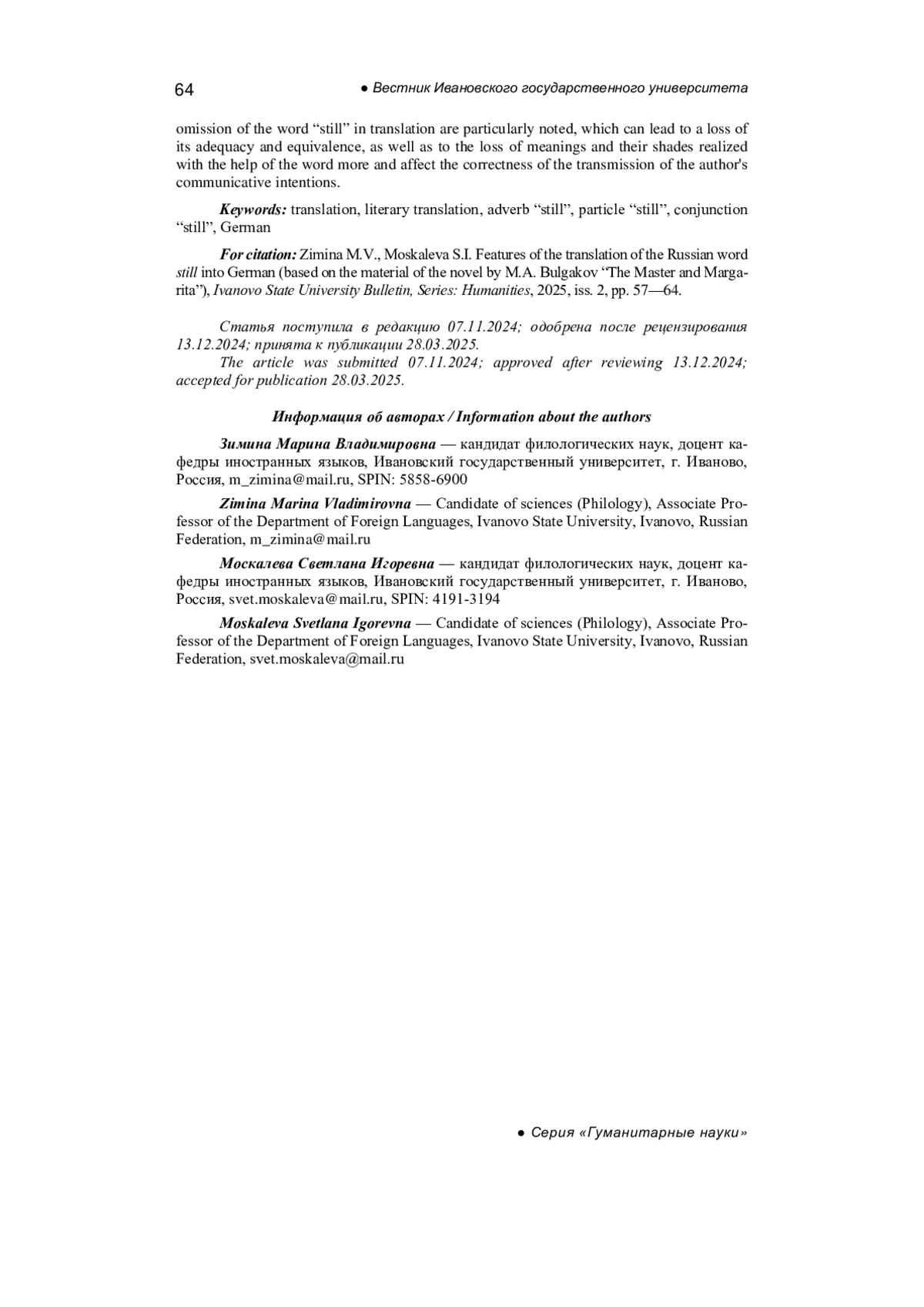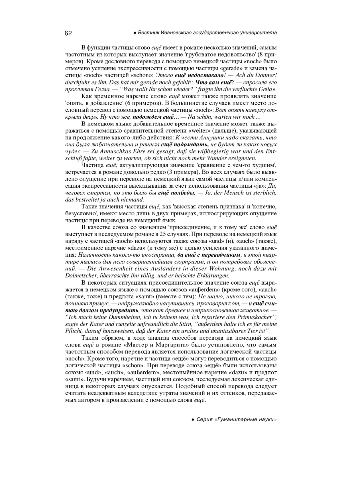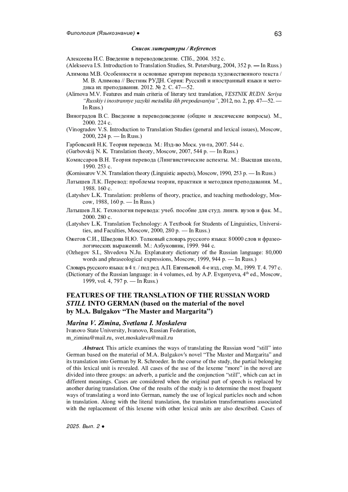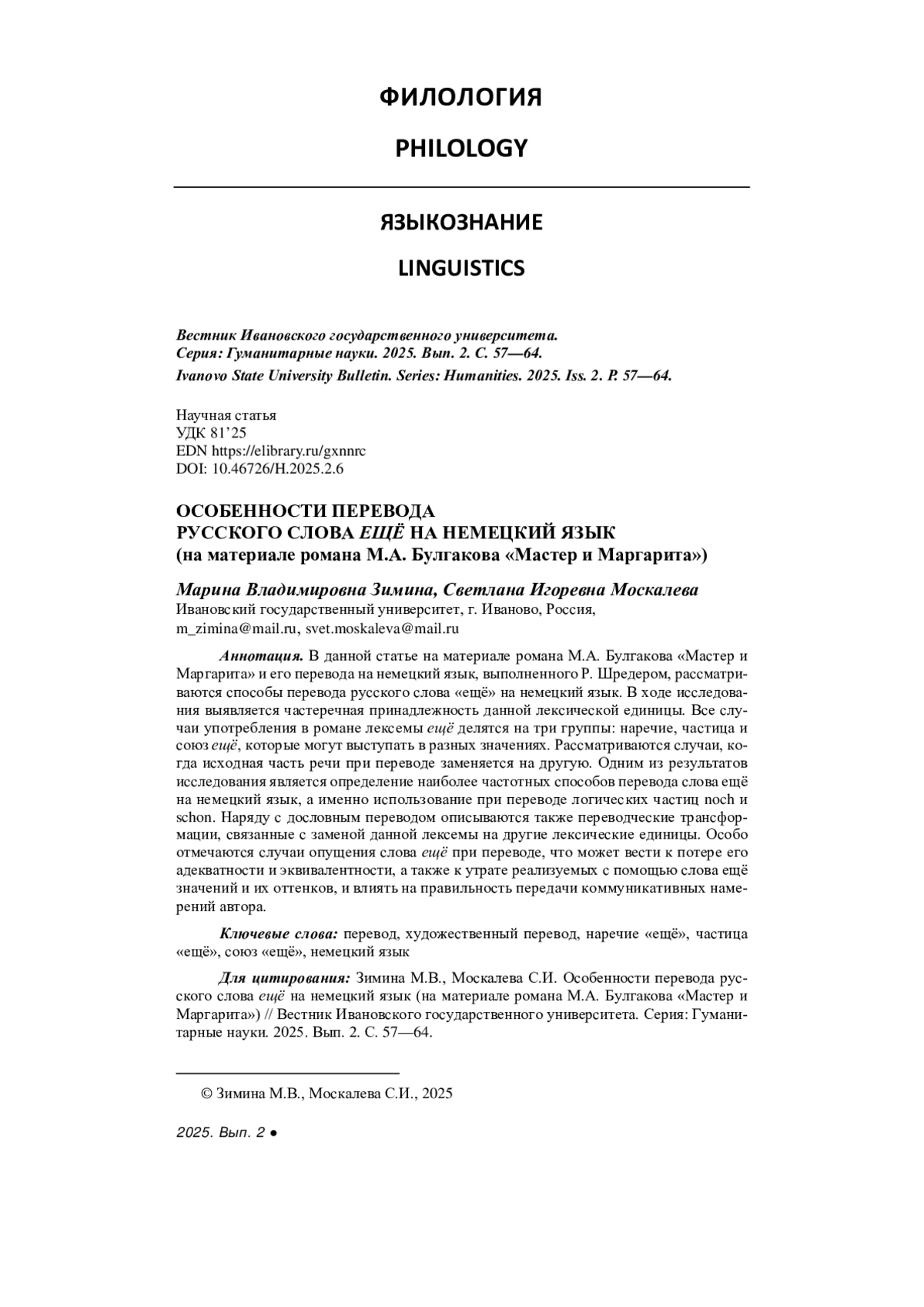 ЗИМИНА М. В., МОСКАЛЕВА С. И. ОСОБЕННОСТИ ПЕРЕВОДА РУССКОГО СЛОВА ЕЩЁ НА НЕМЕЦКИЙ ЯЗЫК (НА МАТЕРИАЛЕ РОМАНА М. А. БУЛГАКОВА «МАСТЕР И МАРГАРИТА») // ВЕСТНИК ИВАНОВСКОГО ГОСУДАРСТВЕННОГО УНИВЕРСИТЕТА. СЕРИЯ: ГУМАНИТАРНЫЕ НАУКИ. 2025. № 2