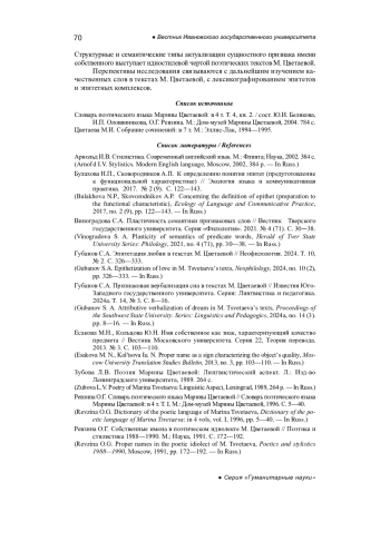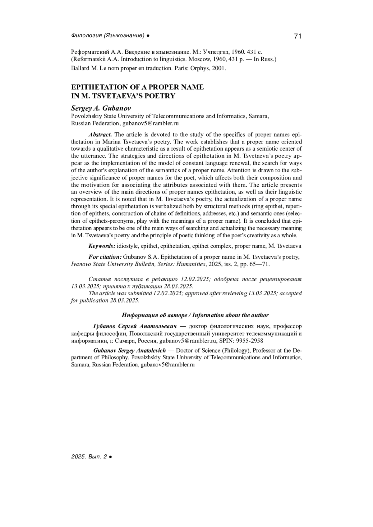 ГУБАНОВ С. А. ЭПИТЕТАЦИЯ ИМЕНИ СОБСТВЕННОГО В ПОЭЗИИ М. ЦВЕТАЕВОЙ // ВЕСТНИК ИВАНОВСКОГО ГОСУДАРСТВЕННОГО УНИВЕРСИТЕТА. СЕРИЯ: ГУМАНИТАРНЫЕ НАУКИ. 2025. № 2