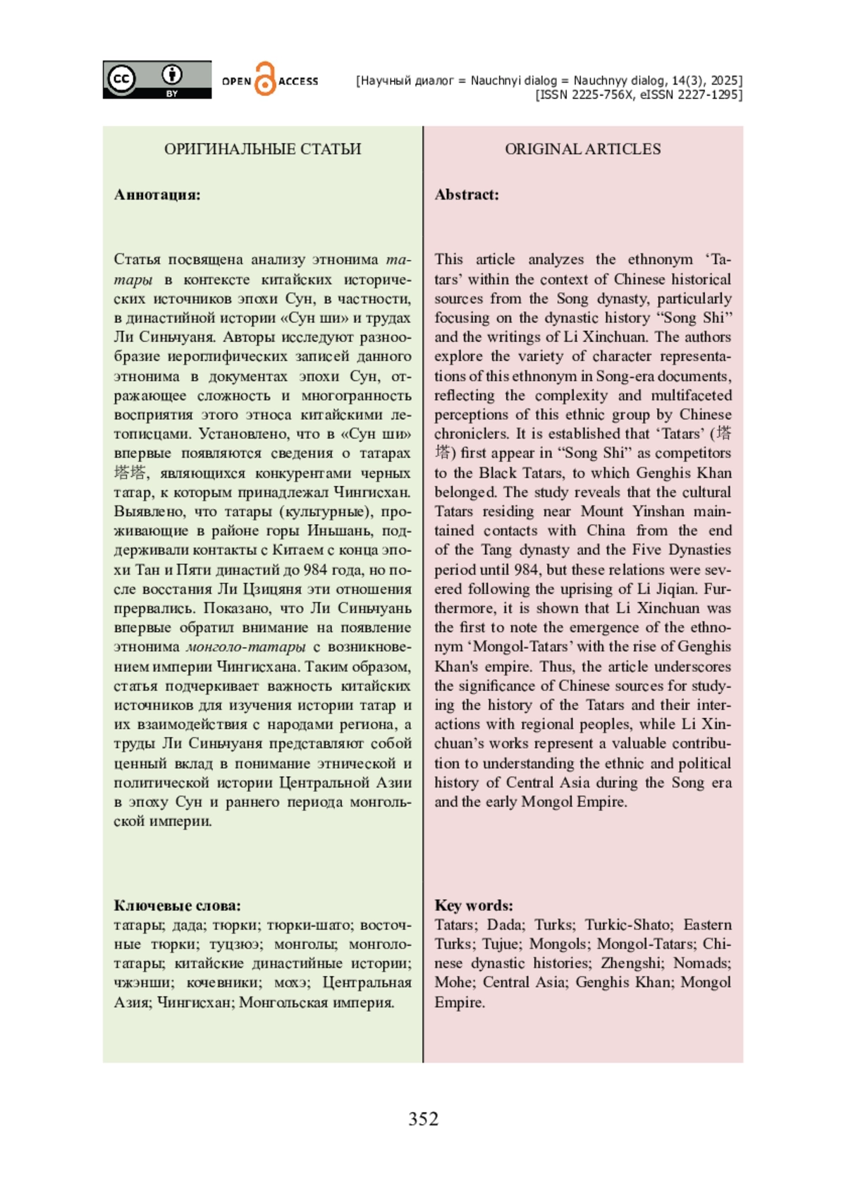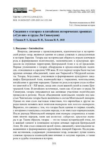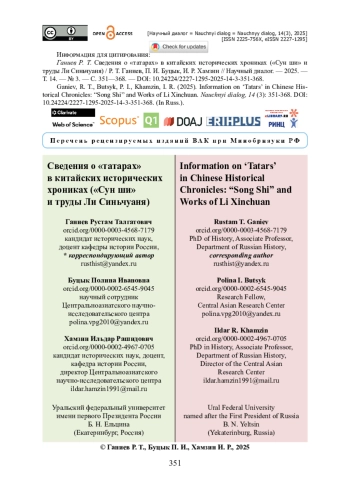 Статья посвящена анализу этнонима татары в контексте китайских исторических источников эпохи Сун, в частности, в династийной истории «Сун ши» и трудах Ли Синьчуаня. Авторы исследуют разнообразие иероглифических записей данного этнонима в документах эпохи Сун, отражающее сложность и многогранность восприятия этого этноса китайскими летописцами. Установлено, что в «Сун ши» впервые появляются сведения о татарах 塔塔, являющихся конкурентами черных татар, к которым принадлежал Чингисхан. Выявлено, что татары (культурные), проживающие в районе горы Иньшань, поддерживали контакты с Китаем с конца эпохи Тан и Пяти династий до 984 года, но после восстания Ли Цзицяня эти отношения прервались. Показано, что Ли Синьчуань впервые обратил внимание на появление этнонима монголо-татары с возникновением империи Чингисхана. Таким образом, статья подчеркивает важность китайских источников для изучения истории татар и их взаимодействия с народами региона, а труды Ли Синьчуаня представляют собой ценный вклад в понимание этнической и политической истории Центральной Азии в эпоху Сун и раннего периода монгольской империи.