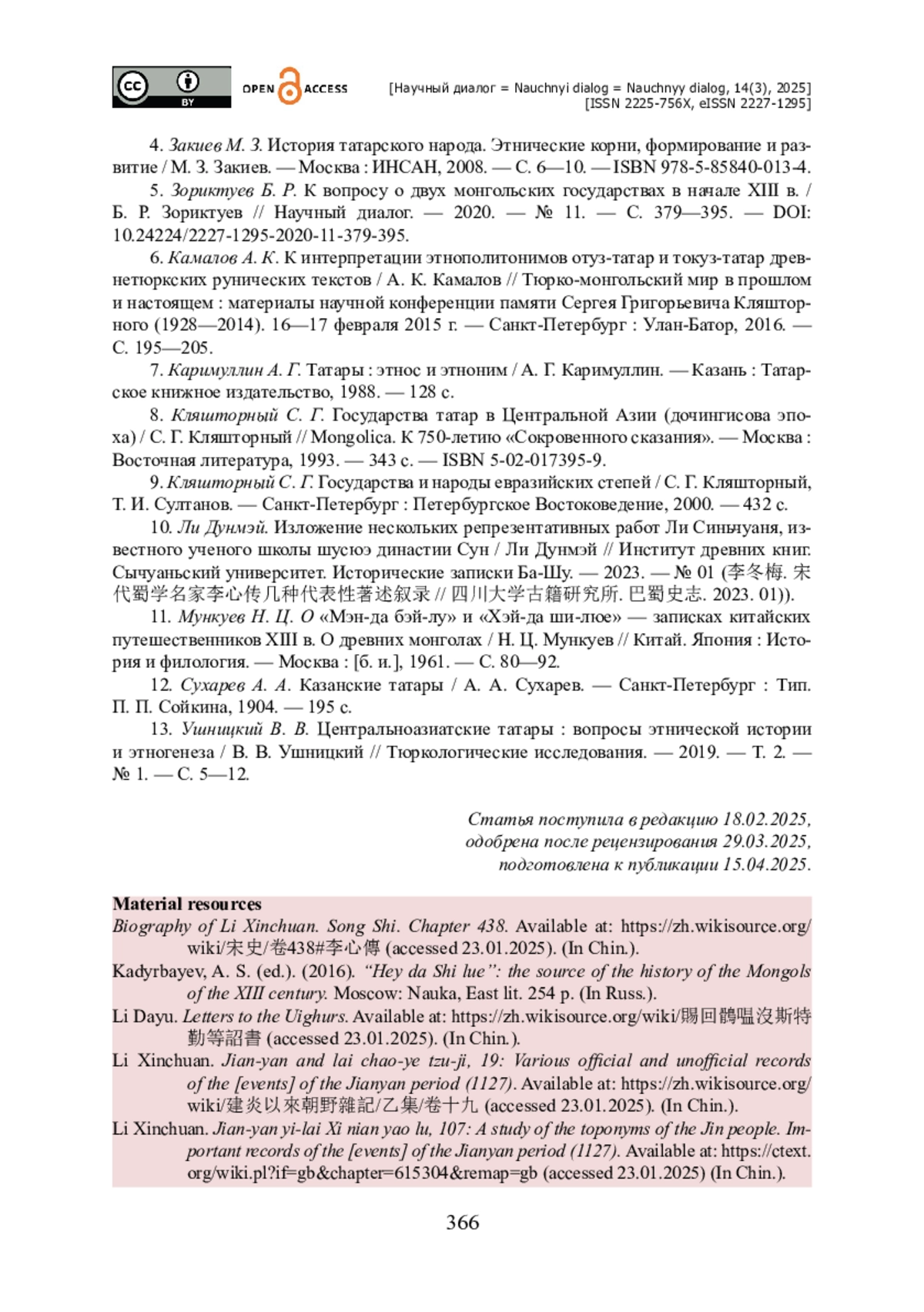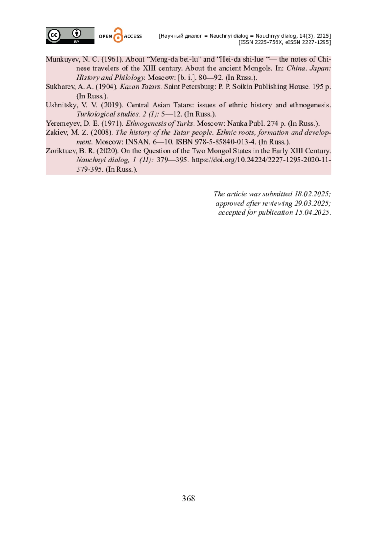 5. Зориктуев Б. Р. К вопросу о двух монгольских государствах в начале XIII в. / Б. Р. Зориктуев // Научный диалог. - 2020. - № 11. - С. 379-395. - https://doi.org/10.24224/2227-1295-2020-11-379-395.