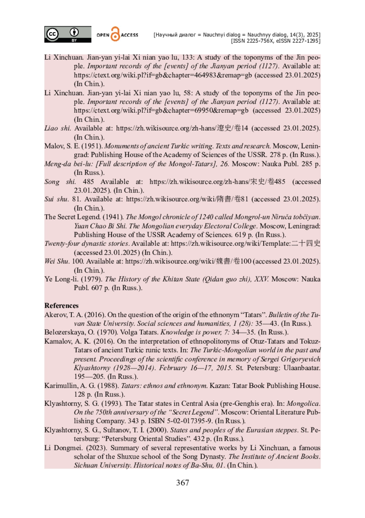 1. Акеров Т. А. К вопросу о происхождении этнонима «татар» / Т. А. Акеров // Вестник Тувинского государственного университета. Социальные и гуманитарные науки. - 2016. - № 1 (28). - С. 35-43.