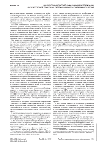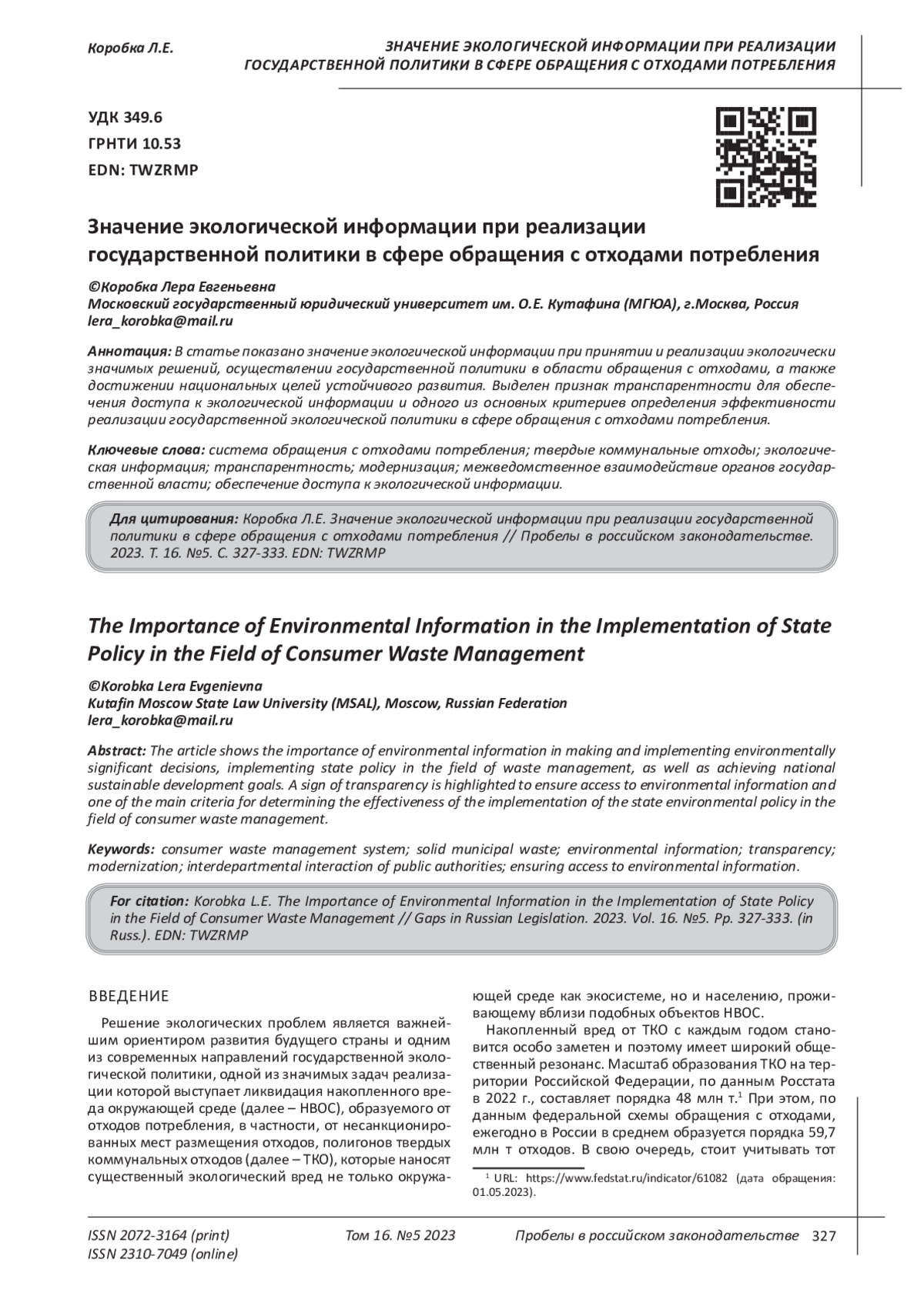 В статье показано значение экологической информации при принятии и реализации экологически значимых решений, осуществлении государственной политики в области обращения с отходами, а также достижении национальных целей устойчивого развития. Выделен признак транспарентности для обеспечения доступа к экологической информации и одного из основных критериев определения эффективности реализации государственной экологической политики в сфере обращения с отходами потребления.