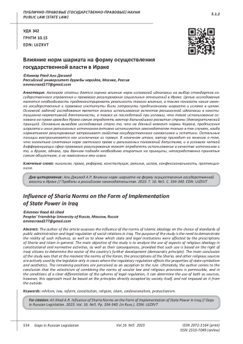 Статья: ВЛИЯНИЕ НОРМ ШАРИАТА НА ФОРМУ ОСУЩЕСТВЛЕНИЯ ГОСУДАРСТВЕННОЙ ВЛАСТИ В ИРАКЕ (2023)