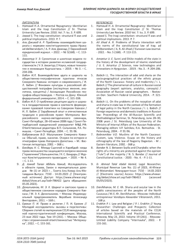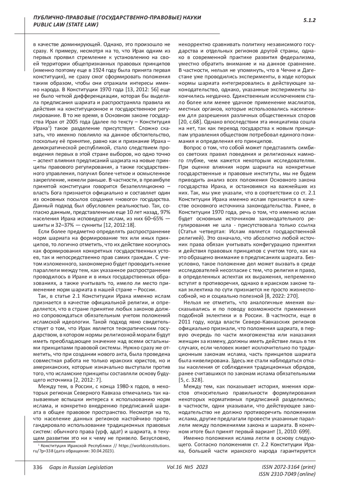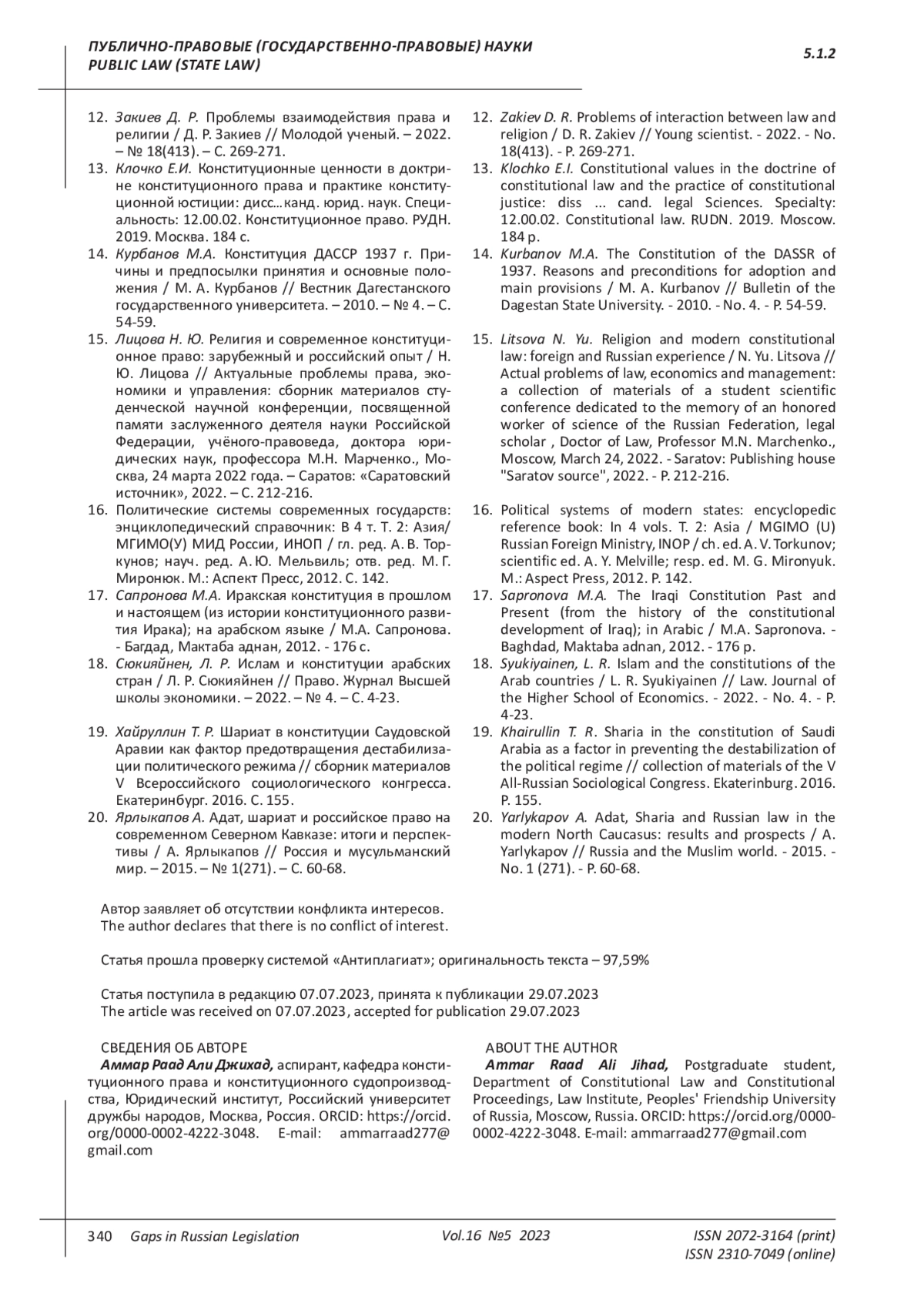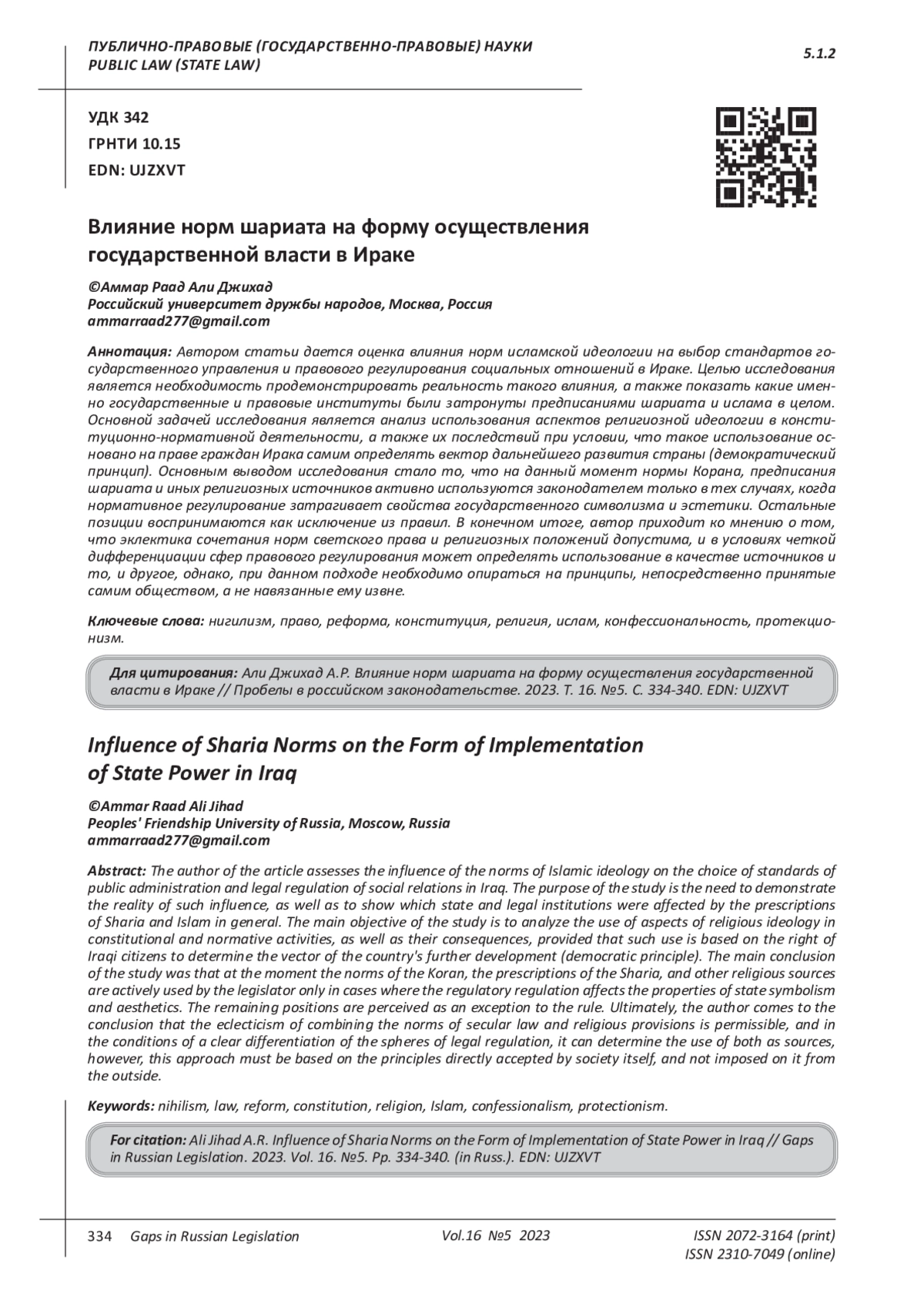 АММАР Р. А. ВЛИЯНИЕ НОРМ ШАРИАТА НА ФОРМУ ОСУЩЕСТВЛЕНИЯ ГОСУДАРСТВЕННОЙ ВЛАСТИ В ИРАКЕ // ПРОБЕЛЫ В РОССИЙСКОМ ЗАКОНОДАТЕЛЬСТВЕ. 2023. Т. 16 № 5