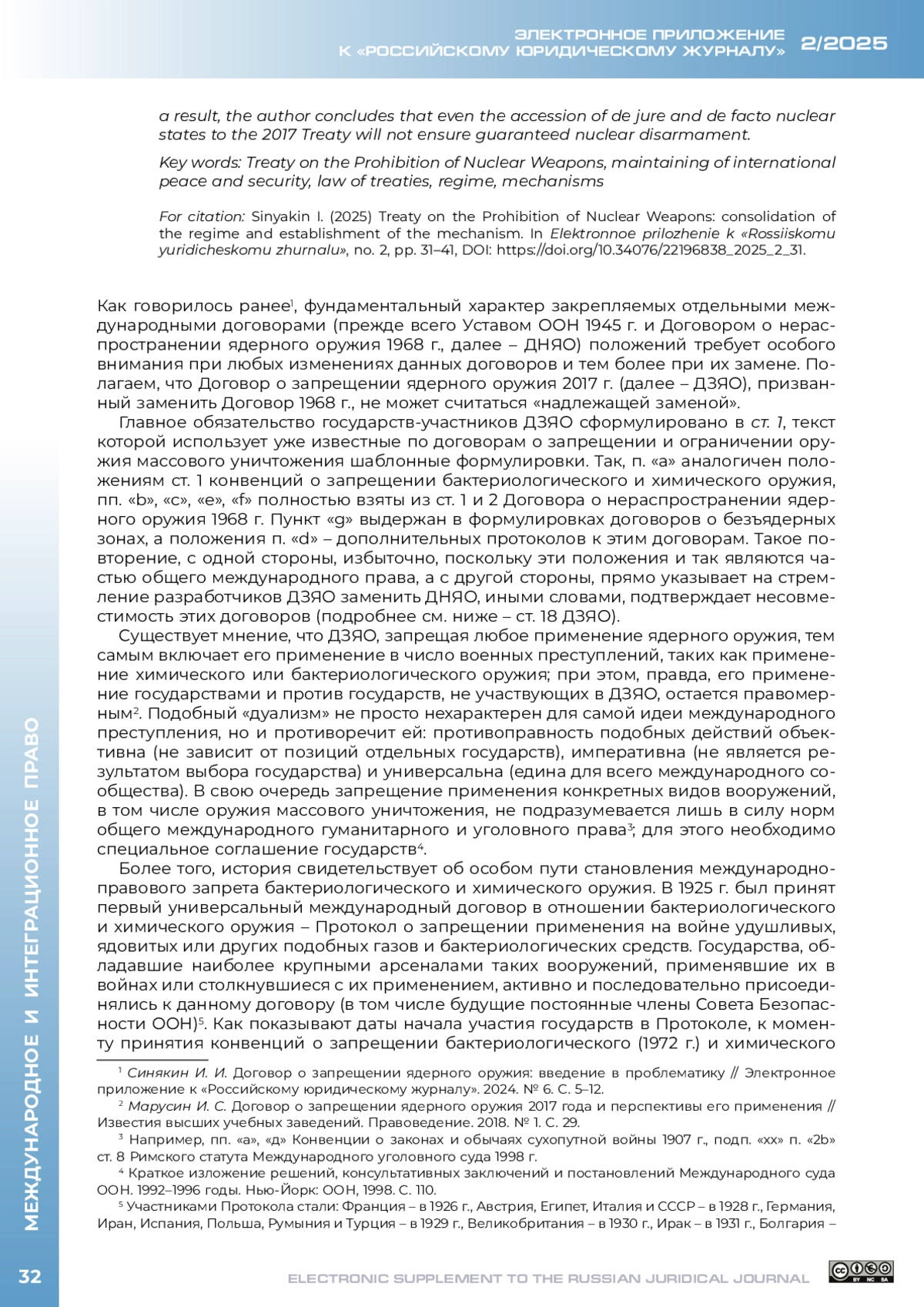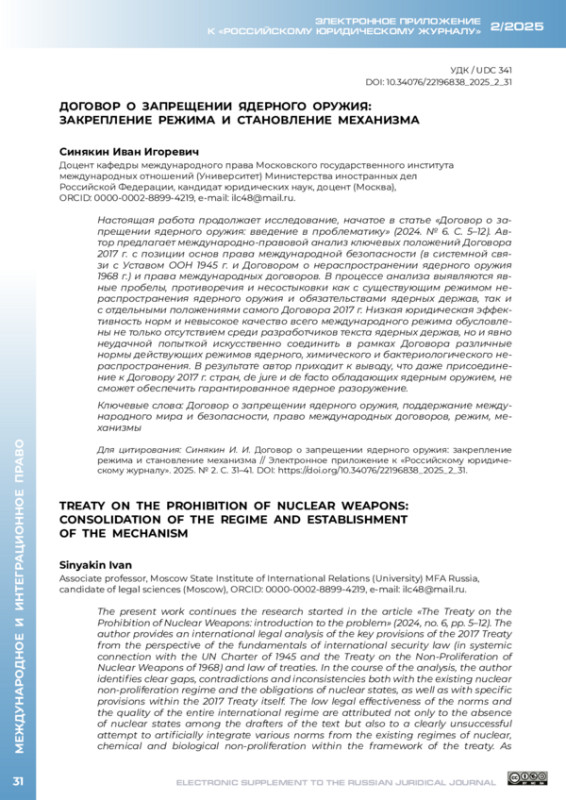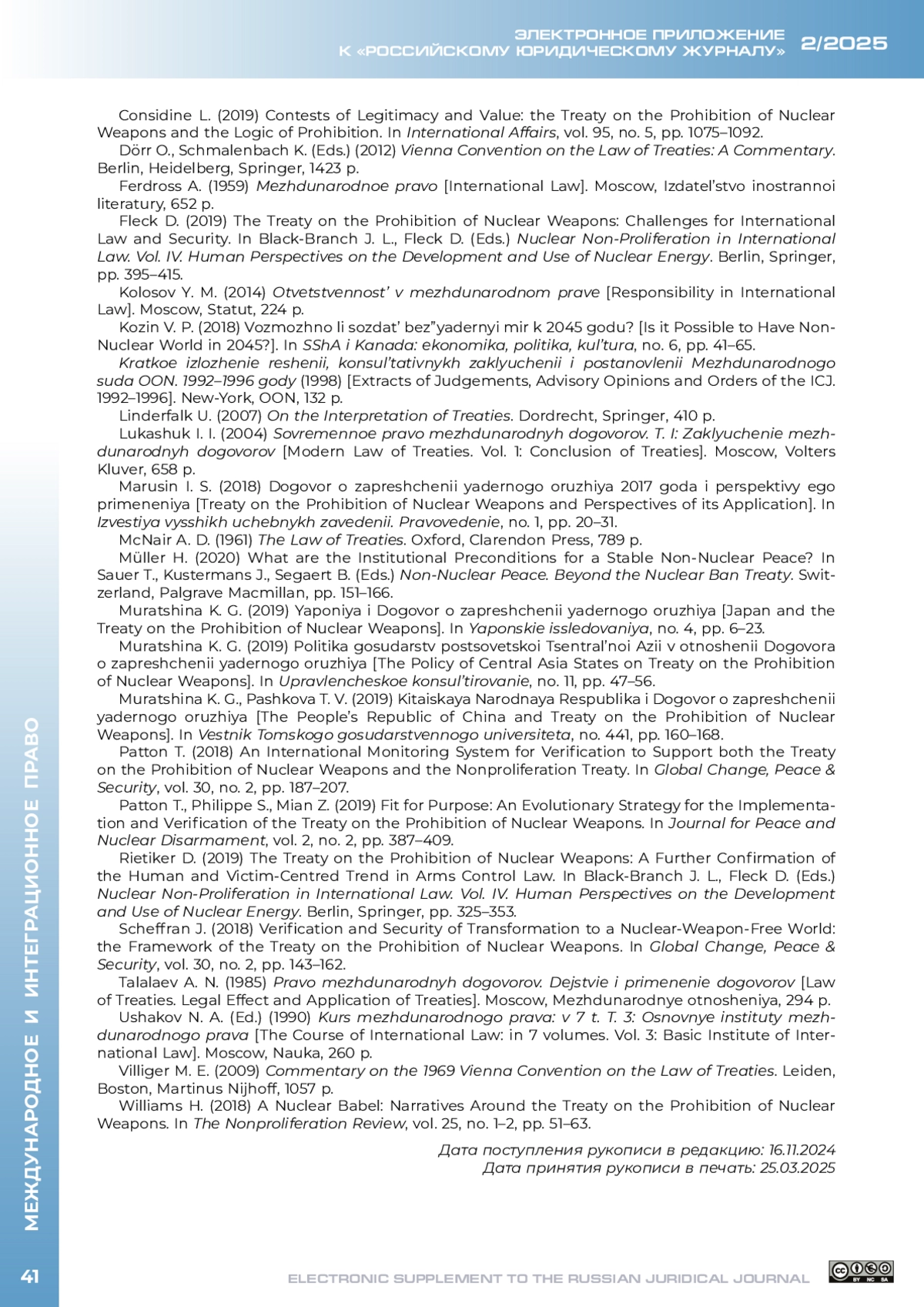 23. Patton T., Philippe S., Mian Z. Fit for Purpose: An Evolutionary Strategy for the Implementation and Verification of the Treaty on the Prohibition of Nuclear Weapons // Journal for Peace and Nuclear Disarmament. 2019. Vol. 2 (2). P. 387-409.