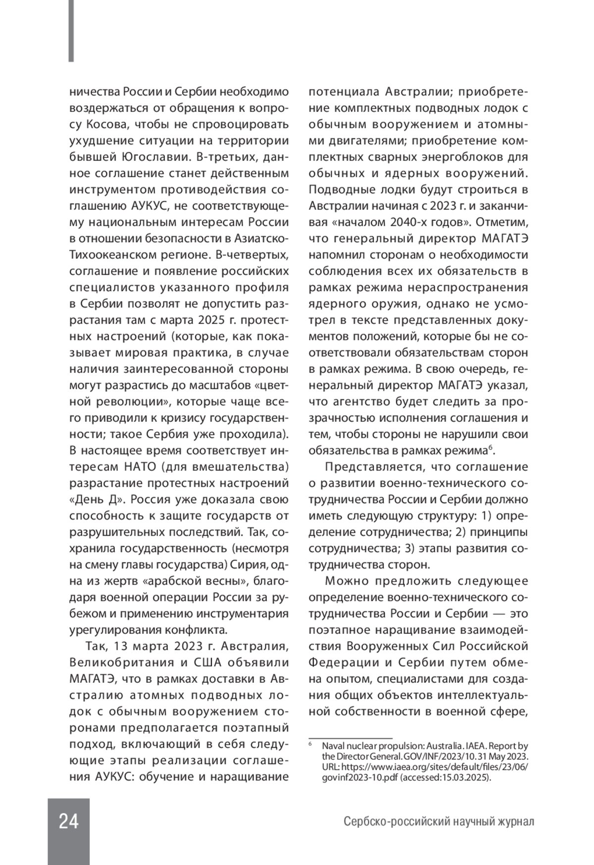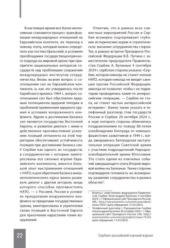 Проблема противодействия гонке вооружений и усилению международной напряженности обрела особую актуальность в условиях того, что вновь возник вопрос о применении ядерного оружия в условиях вооруженного конфликта и, соответственно, вопрос о достижении паритета позиций противодействующих сторон для предотвращения использования такого оружия. Установлено, что развитие диалога России и Сербии в военно-технической сфере с учетом геополитического положения Сербии и мощи России сможет обеспечить противодействие усилению позиций НАТО, что послужит основой для достижения баланса сил на Евразийском континенте и предотвращения усиления напряженности. Определена значимость поэтапного налаживания сотрудничества сторон для сохранения взаимного доверия и интереса к постепенному переходу к более тесному диалогу для достижения национальных интересов сторон: России — укрепления системы обеспечения безопасности, Сербии — достижения баланса в проводимом ею внешнеполитическом курсе. В результате проведения исследования автор приходит к выводу о значимости заключения межгосударственного соглашения России и Сербии о развитии военно-технического сотрудничества.
