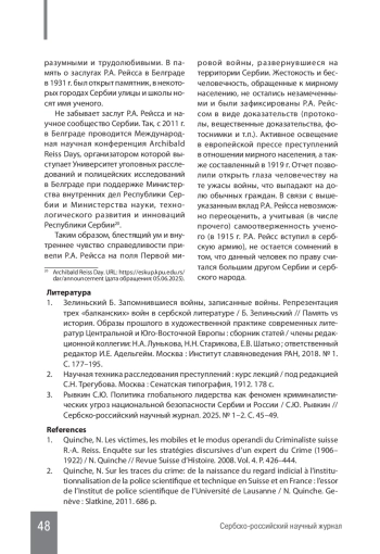 Работа посвящена изучению роли Рудольфа Арчибальда Рейсса в расследовании военных преступлений австро-венгерских солдат (и их союзников) на территории Сербии в годы Первой мировой войны (1914–1918). Автор отмечает активную работу Р. А. Рейсса в освещении событий на территории Сербии и основополагающую роль в становлении научных и практических основ расследования военных преступлений.
