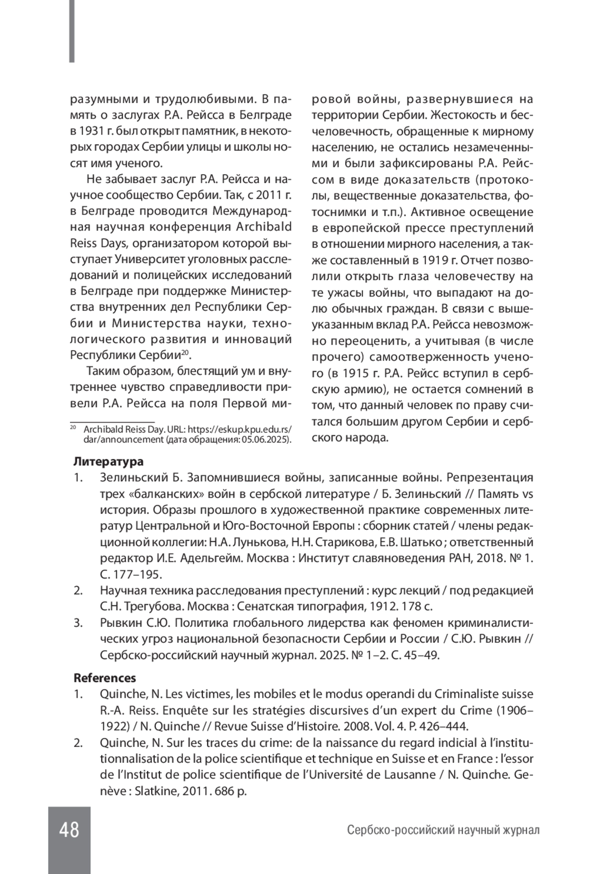 4. Quinche, N. Les victimes, les mobiles et le modus operandi du Criminaliste suisse R.-A. Reiss. Enquete sur les strategies discursives d’un expert du Crime (19061922) / N. Quinche // Revue Suisse d’Histoire. 2008. Vol. 4. P. 426-444.