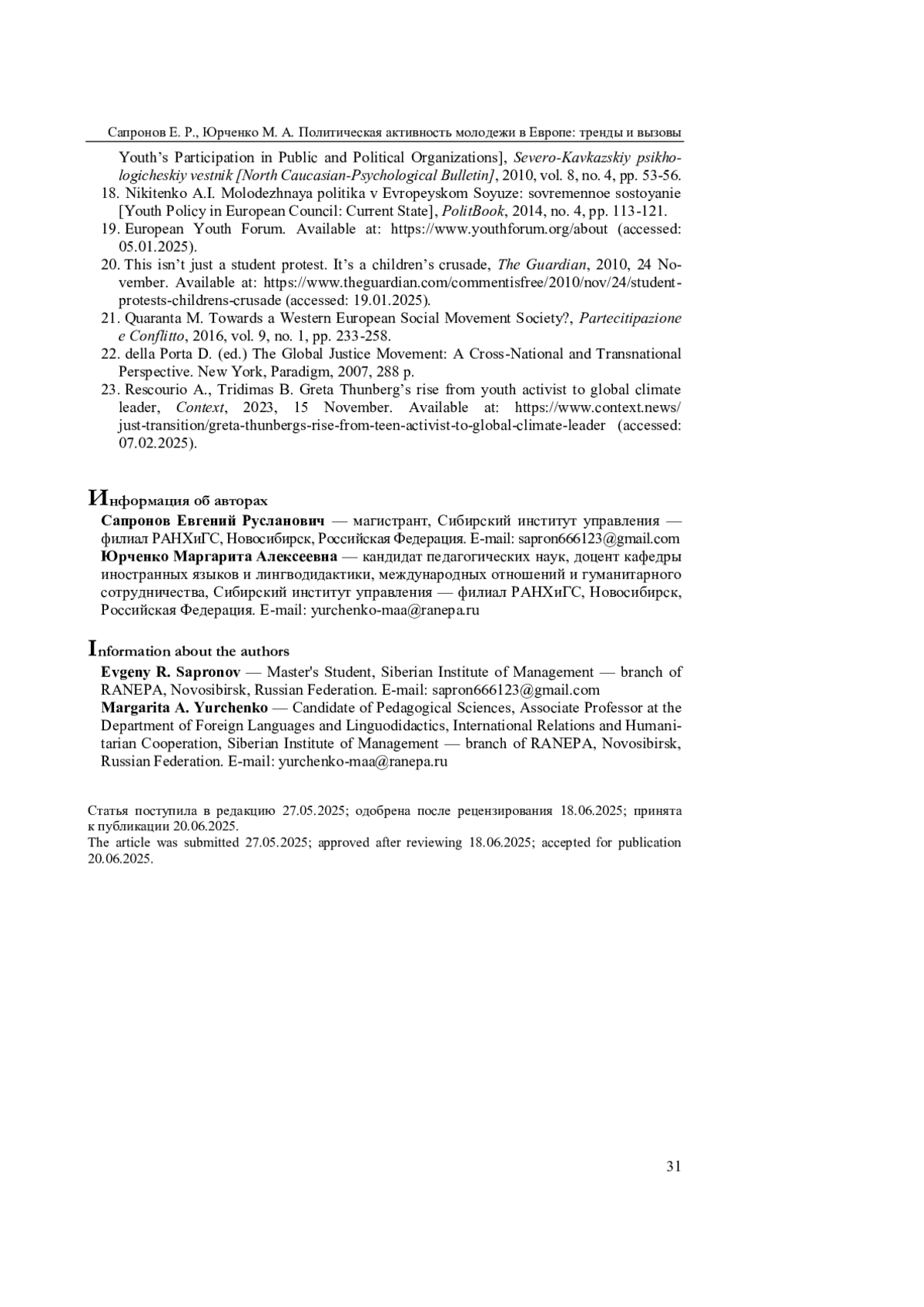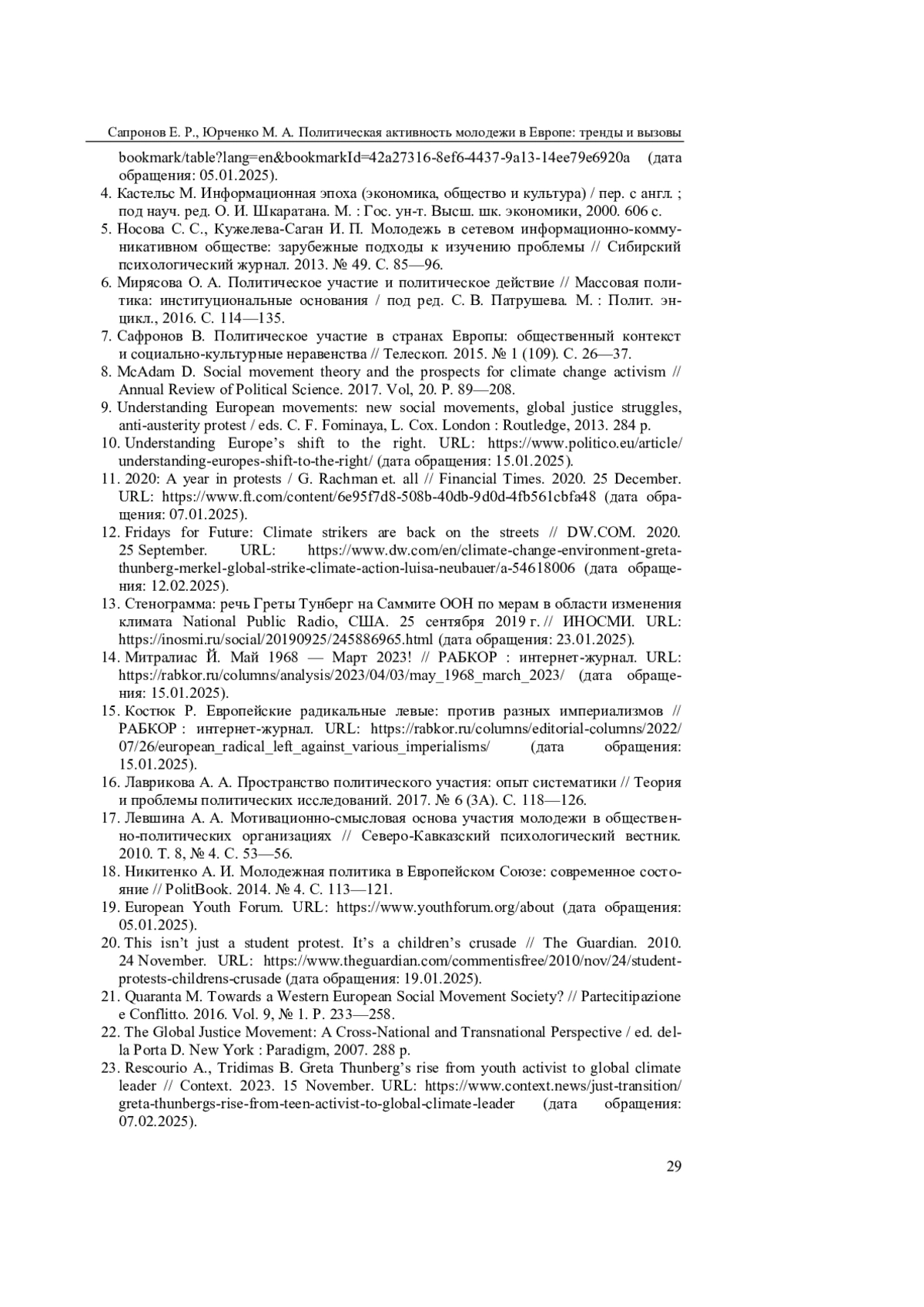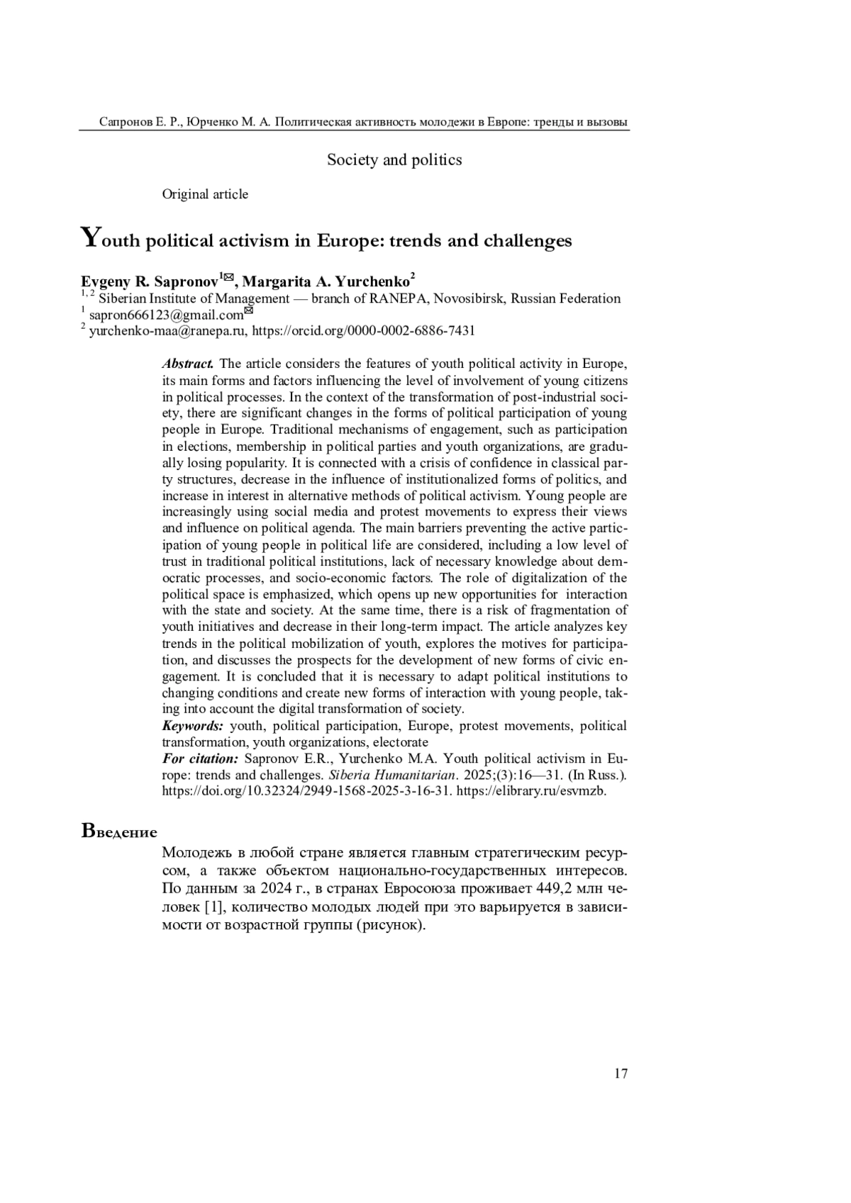 САПРОНОВ Е. Р., ЮРЧЕНКО М. А. ПОЛИТИЧЕСКАЯ АКТИВНОСТЬ МОЛОДЕЖИ В ЕВРОПЕ: ТРЕНДЫ И ВЫЗОВЫ // СИБИРЬ ГУМАНИТАРНАЯ. 2025. № 3 (11)